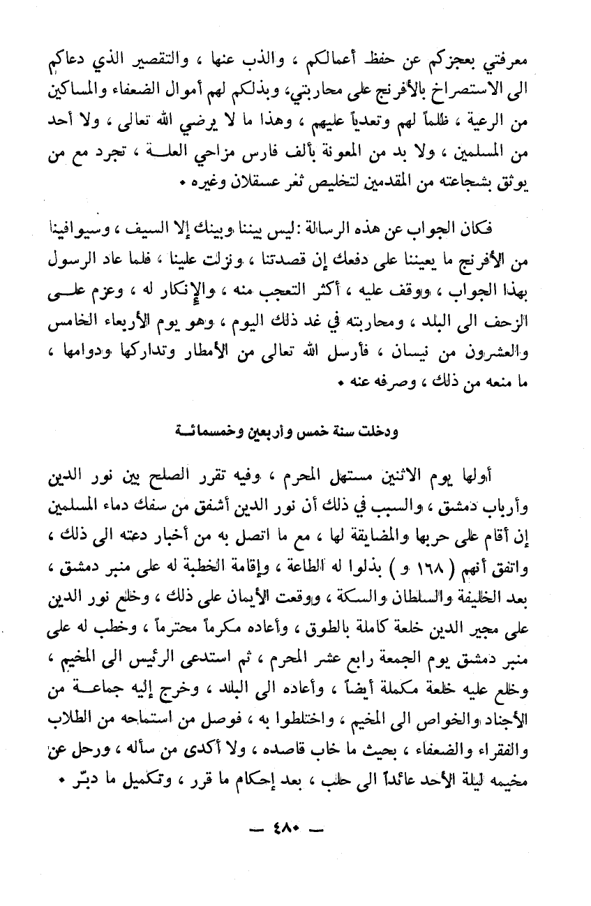 معرفتي بعجزكم عن حفظ أعمالكم والذب عنها والتقصير الذي دعاكم إلى الاستصراخ بالافرنج على محاربتي وبذلكم لهم أموال الضعفاء والمساكين من الريعة ظلماً لهم وتعدياً عليكم وهذا ما لا يرضي الله تعالى ولا أحداً من المسلمين ولا بد من المعونة بألف فارس نزاح العلة تجرد مع من توثق بشجاعته من المقدمين لتخليص ثغر عسقلان وغيره