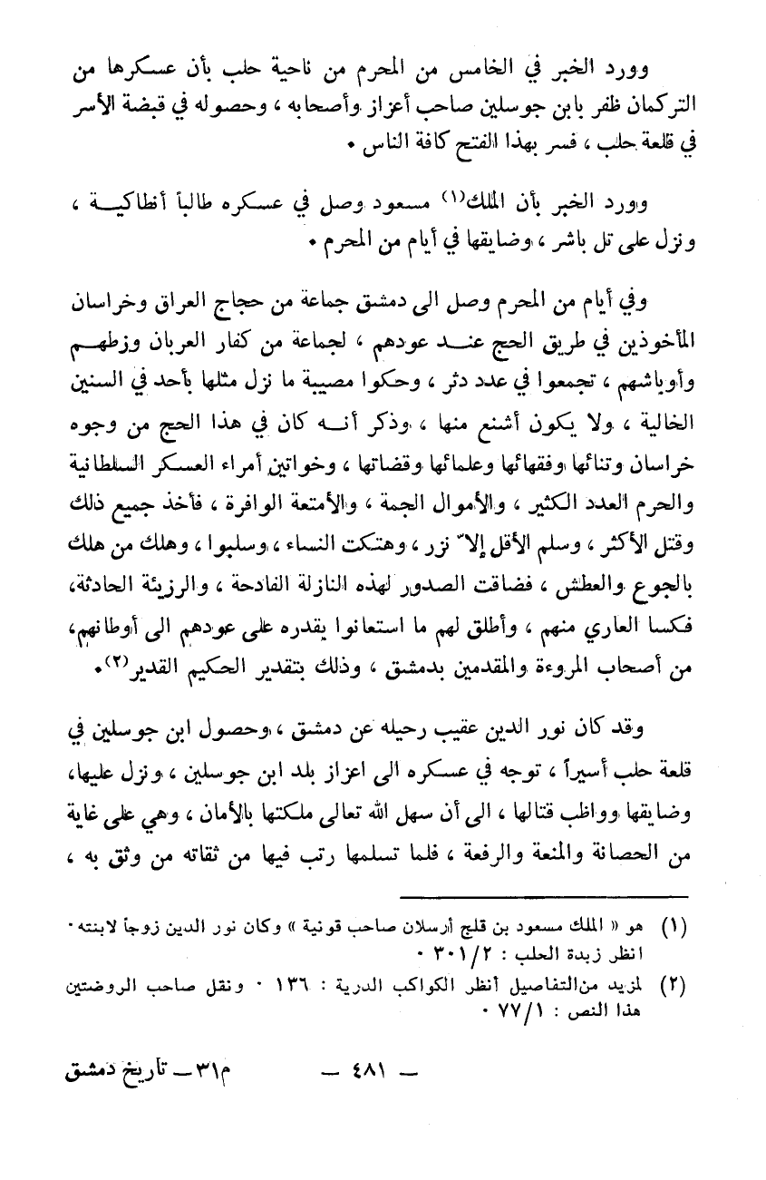 وورد الخبر في الخامس من المحرم من ناحية حلب بأن عسكرها من التركمان ظفر بابن جوسلين صاحب اعزاز وأصحابه وحصوله في قبضة الأسر في قلعة حلب فسر بهذا الفتح كافة الناس. وورد الخبر بأن الملك مسعود وصل في عسكره طالباً أنطاكية ونزل على تل باشر وضايقها في أيام من المحرم وفي أيام من المحرم وصل إلى دمشق جماعة من حجاج العراق وخراسان المأخوذون في طريق الحج عند عودهم لجماعة من كفار العربان وزطهم وأوباشهم تجمعوا في عدد دثر وحكوا مصيبةً ما نزل مثلها بأحد في السنين الخالية ولا يكون أشنع منها وذكر أنه كان في هذا الحج من وجوه خراسان وتنائها وفقهائها وعلمائها وقضاتها وخواتين أمراء العسكر السلطانية والحرم العدد الكثير والأموال الجمة والأمتعة الوافرة فأخذ جميع ذلك وقتل الأكثر وسلم الأقل الأنزر وهتكت النساء وسلبوا وهلك من هلك بالجوع والعطش فضاقت الصدور لهذه النازلة الفادحة والرزيئة الحادثة فكسا العاري منهم وأطلق لهم ما استعانوا بقدره على عودهم إلى أوطانهم من أصحاب المروءة والمقدمين بدمشق وذلك بتقدير الحكيم القدير وقد كان نور الدين عقيب رحيله عن دمشق وحصول ابن جوسلين في قلعة حلب أسيراً توجه في عسكره إلى اعزاز بلد ابن جوسلين ونزل عليها وضايقها وواظب قتالها إلى أن سهل الله تعالى ملكتها بالأمان وهي على غاية من الحصانة والمنعة والرفعة فلما تسلمها رتب فيها من ثقاته من وثق به