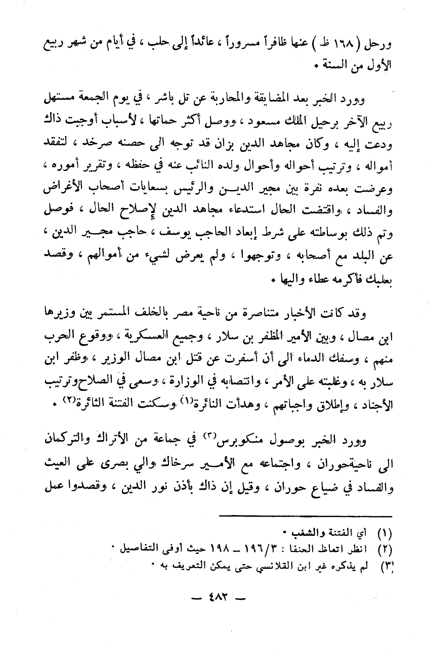 ورحل عنها ظافراً مسروراً عائداً إلى حلب في أيام من شهر ربيع الأول من السنة وورد الخبر بعد المضايقة والمحاربة عن تل باشر في يوم الجمعة مستهل ربيع الآخر برحيل الملك مسعود ووصل أكثر حماتها لأسباب أوجبت ذاك ودعت إليه وكان مجاهد الدين بزان قد توجه إلى حصنه صرخد لتفقد أمواله وترتيب أحواله وأحوال ولده النائب عنه في حفظه وتقرير أموره وعرضت بعده نفرة بين مجير الدين والرئيس بسعايات أصحاب الأغراض والفساد واقتضت الحال استدعاء مجاهد الدين لإصلاح الحال فوصل وتم ذلك بوساطته على شرط إبعاد الحاجب يوسف حاجب مجير الدين عن البلد مع أصحابه وتوجهوا ولم يعرض لشيء من أموالهم وقصد بعلبك فأكرمه عطاء واليها وقد كانت الأخبار متناصرةً من ناحية مصر بالخلف المستمر بين وزيرها ابن مصال وبين الأمير المظفر بن سلار وجميع العسكرية ووقوع الحرب منهم وسفك الدماء إلى أن أسفرت عن قتل ابن مصال الوزير وظفر ابن سلار به وغلبته على الأمر وانتصابه في الوزارة وسعى في صلاح وترتيب الأجناد وإطلاق واجباتهم وهدت النائرة وسكنت الفتنة الثائرة وورد الخبر بوصول منكوبرس في جماعة من الأتراك والتركمان إلى ناحية حوران واجتماعه مع الأمير سرخاك والي بصرى على العيث والفساد في ضياع حوران وقيل إن ذاك بإذن نور الدين وقصدوا عمل