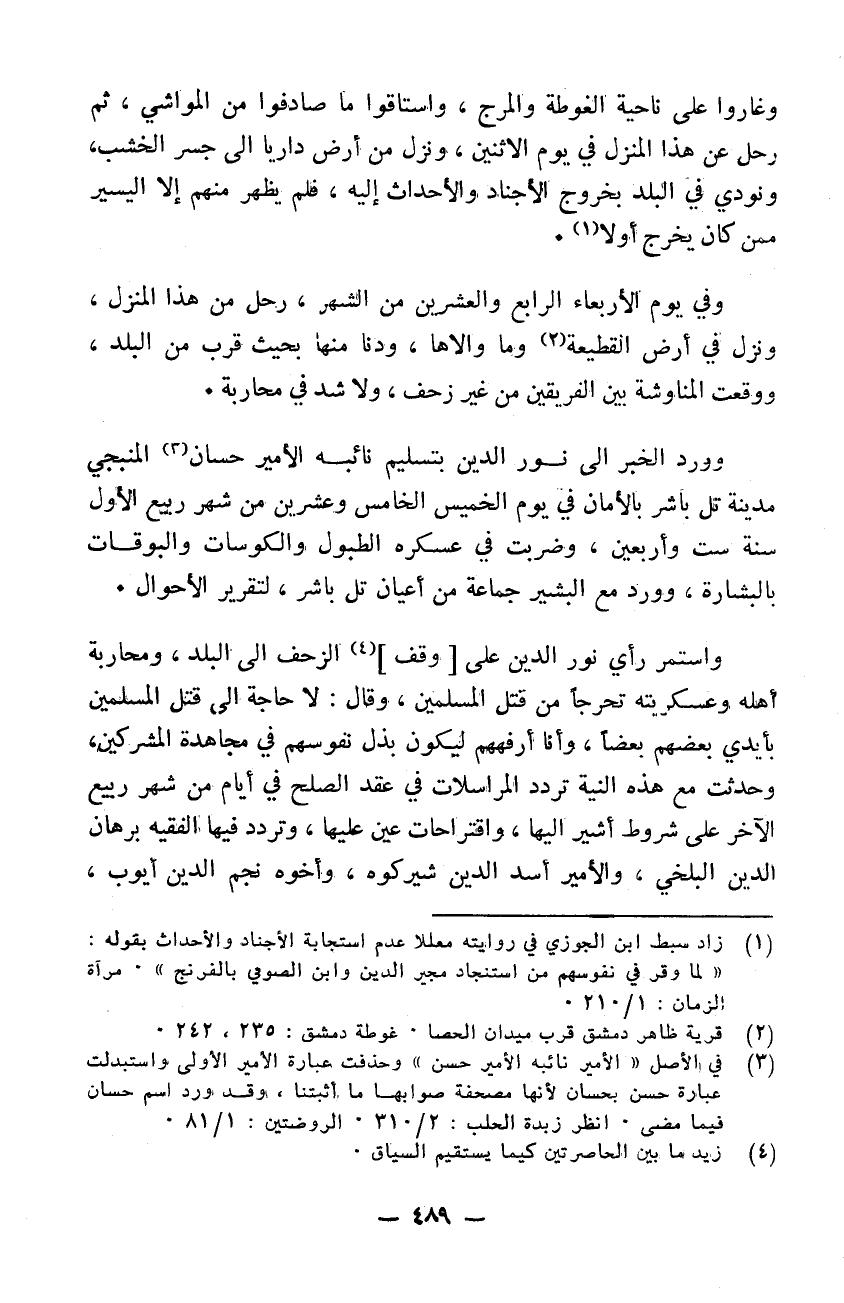 وغاروا على ناحية الغوطة والمرج واستاقوا ما صادفوا من المواشي ثم رحل عن هذا المنزل في يوم الاثنين ونزل من أرض داريا إلى جسر الخشب ونودي في البلد بخروج الأجناد والأحداث إليه فلم يظهر منهم إلا اليسير ممن كان يخرج أولاً وفي يوم الأربعاء الرابع والعشرين من الشهر رحل من هذا المنزل ونزل في أرض القطيعة وما والاها ودنا منها بحيث قرب من البلد ووقعت المناوشة بين الفريقين من غير زحف ولا شد في محاربة وورد الخبر إلى نور الدين بتسليم الأمير نايبه الأمير حسن حسان المنبجي مدينة تل باشر بالأمان في يوم الخميس الخامس والعشرين من شهر ربيع الأول سنة 46 وضربت في عسكره الطبول والكوسات والبوقات بالبشارة وورد مع المسير جماعة من أعيان تل باشر لتقرير الأحوال واستمر رأي نور الدين على الزحف إلى البلد ومحاربة أهله وعسكريته تحرجاً من قتل المسلمين وقال: لا حاجة إلى قتل المسلمين بأيدي بعضهم بعضاً وأنا أرفههم ليكون بذل نفوسهم في مجاهدة المشركين. وحدثت مع هذه النية تردد المراسلات في عقد الصلح في أيام من شهر ربيع الآخر على شروط أشير إليها واقتراحات عين عليها وتردد فيها الفقيه برهان الدين علي البلخي والأمير أسد الدين شيركوه وأخوه نجم الدين أيوب