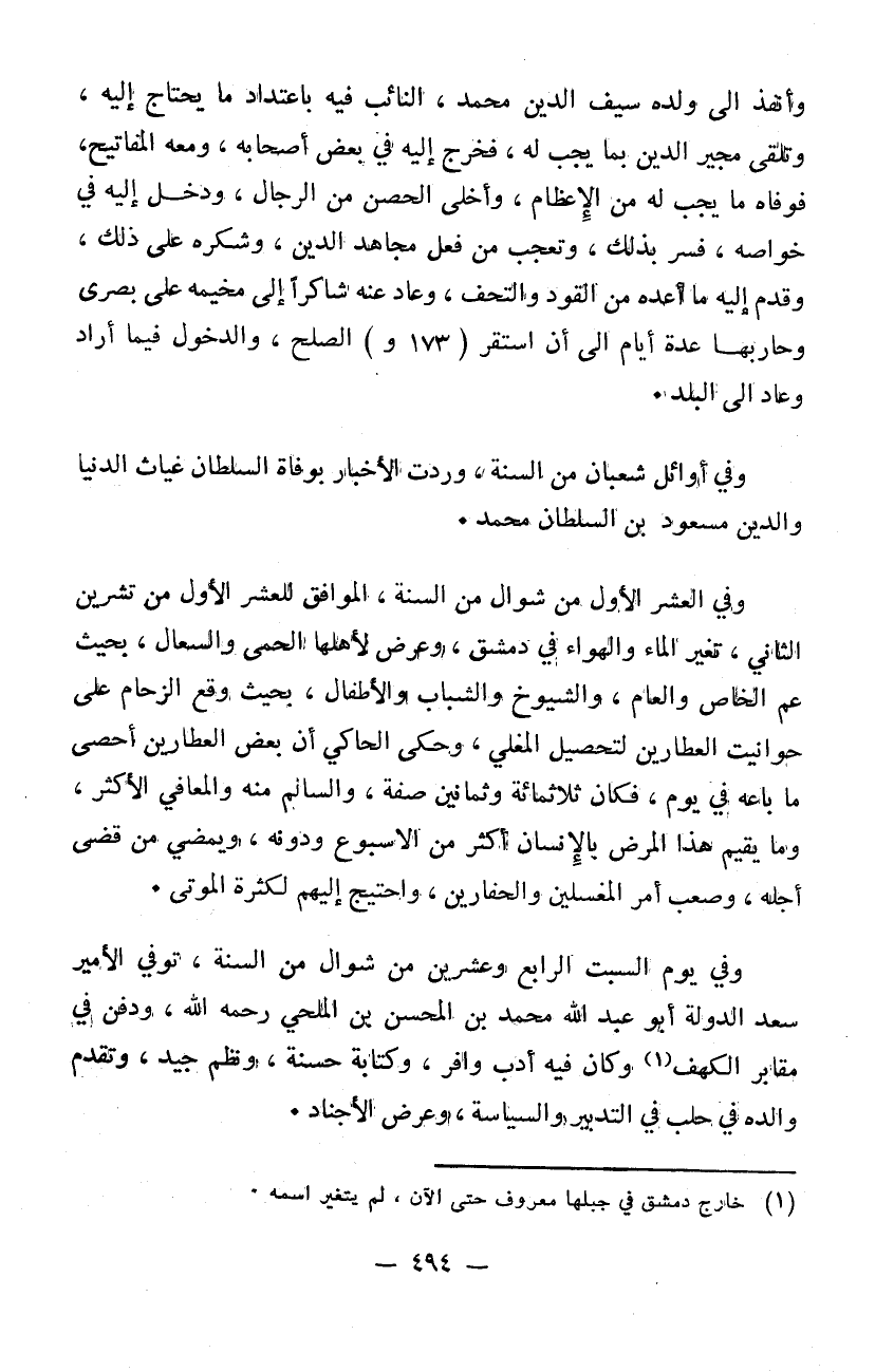وأنفذ إلى ولده سيف الدين محمد النائب فيه باعتداد ما يحتاج إليه وتلقى مجير الدين بما يجب له فخرج إليه في بعض أصحابه ومعه المفاتيح فوفاه ما يجب له من الاعظام وأجلى الحصن من الرجال ودخل إليه في خواصه. فسر بذلك وتعجب من فعل مجاهد الدين وشكره على ذلك وقدم إليه ما أعده من القرد والتحف وعاد عنه شاكراً إلى مخيمه على بصرى وحاربها عدة أيام إلى أن استقر الصلح والدخول فيما أراد وعاد إلى البلد. وفي أوائل شعبان من السنة وردت الأخبار بوفاة السلطان غياث الدنيا والدين مسعود ابن السلطان محمد وفي العشر الأول من شوال من السنة الموافق للعشر الأول من تشرين الثاني تغير الماء والهواء في دمشق وعرض لأهلها الحمى والسعال بحيث عم الخاص والعام والشيوخ والشباب والأطفال بحيث وقع الزحام على حوانيت العطارين لتحصيل المغلي. وحكى الحاكي أن بعض العطارين أحصى ما باعه في يوم فكان ثلاثمائة وثمانين صفةً والسالم منه والمعفى الأكثر وما يقيم هذا المرض بالانسان أكثر من الاسبوع ودونه ويمضي من قضى أجله وضعف أمر المغسلين والحفارين واحتيج إليهم لكثرة الموتى وفي يوم السبت الرابع وعشرين من شوال من السنة توفي الأمير سعد الدولة أبو عبد الله محمد بن المحسن بن الملحي رحمه الله ودفن في مقابر الكهف وكان فيه اذب وافر وكتابة حسنة ونظم جيد وتقدم والده في حلب في التدبير والسياسة وعرض الأجناد