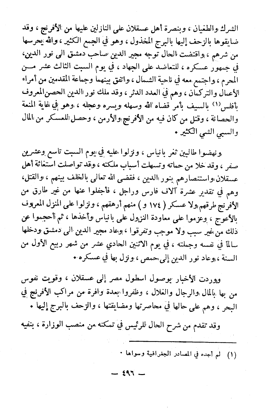 الشرك والطغيان بنصرة أهل عسقلان على النازلين عليها من الافرنج وقد ضايقوها بالزحف إليها بالبرج المخذول وهو في الجمع الكثير والله يحرسها من شرهم واقتضت الحال توجه مجير الدين صاحب دمشق إلى نور الدين في جمهور عسكره للتعاضد على الجهاد في يوم السبت الثالث عشر من المحرم واجتمع معه في ناحية الشمال واتفق بينهما وجماعة المقدمين من أمراء الأعمال والتركمان وهم في العدد الدثر. وقد ملك نور الدين الحصن المعروف بافلس بالسيف بأمر قضاه الله وسهله ويسره وعجله وهو في غاية المنعة والحصانة وقتل من كان فيه من الافرنج والأرمن وحصل للعسكر من المال والسبي الشيء الكثير ونهضوا طالبين ثغر بانياس ونزلوا عليه في يوم السبت تاسع وعشرين صفر وقد خلا من حماته وتسهلت أسباب ملكته وقد تواصلت استغاثة أهل عسقلان واستنصارهم بنور الدين فقضى الله تعالى بالخلف بينهم والقتل وهم في تقدير عشرة ألف فارس وراجل فأجفلوا عنها من غير طارق من الافرنج طرقهم ولا عسكر منهم أرهقهم ونزلوا على المنزل المعروف بالأعوج وعزموا على معادة النزول على بانياس وأخذها ثم أحجموا عن ذلك من غير سبب ولا موجب وتفرقوا. وعاد مجير الدين إلى دمشق ودخلها سالماً في نفسه وجملته في يوم الاثنين الحادي عشر من شهر ربيع الأول من السنة وعاد نور الدين إلى حمص ونزل بها في عسكره ووردت الأخبار بوصول اسطول مصر إلى عسقلان وقويت نفوس من بها بالمال والرجال والغلال وظفروا بعدة وافرة من مراكب الافرنج في البحر وهم على حالهم في محاصرتها ومضايقتها والزحف بالبرج إليها قد تقدم من شرح الحال للرئيس في تمكنه من منصب الوزارة بنفيه