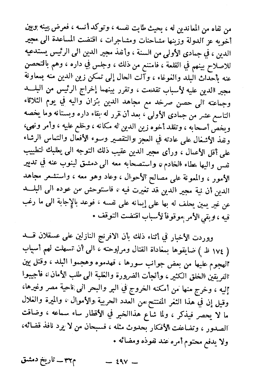 من نفاه من المعاندين له بحيث طابت نفسه وتوكد أنسه فعرض بينه وبين أخويه عز الدولة وزينها مشاحنات ومشاجات اقتضت المساعدة إلى مجير الدين في جمادى الأولى من السنة وأنفذ مجير الدين إلى الرئيس يستدعيه للاصلاح بينهم في القلعة فامتنع من ذلك وجلس في داره وهم بالتحصن عنه بأحداث البلد والغوغاء وآلت الحال إلى تمكن زين الدين منه بمعاونة مجير الدين عليه لأسباب تقدمت وتقرر بينهما إخراج الرئيس من البلد وجماعته إلى حصن صرخد مع مجاهد الدين بزان واليه في يوم الثلاثاء التاسع عشر من جمادى الأولى بعد أن قرر له بقاء بداره وبستانه وما يخصه ويخص أصحابه وتقلد أخوه زين الدين له مكانه وخلع عليه وأمر ونهى ونفذ الأشغال على عادته في العجز والتقصير وسوء الأفعال والتماس الرشاء على أقل الأعمال. ورأى مجير الدين عقيب ذلك التوجه إلى بعلبك لتطييب نفس واليها عطاء الخادم واستصحابه معه إلى دمشق لينوب عنه في تدبير الأمور والأعمال والمعونة على مصالح الأحوال وعاد وهو معه واستشعر مجاهد الدين أن نية مجير الدين قد تغيرت فيه فاستوحش من عوده إلى البلد عن غير يمين يحلف له بها على أيمانه على نفسه فوعد بالاجابة إلى ما رغب فيه وبقي الأمر موقوفاً لأسباب اقتضت التوقف ووردت الأخبار في أثناء ذلك بأن الافرنج النازلين على عسقلان قد ضايقوها بمغاداة القتال ومراوحته إلى أن تسهلت لهم أسباب الهجوم عليها من بعض جوانب سورها فهدموه وهجموا البلد وقتل بين الفريقين الخلق الكثير والجأت الضرورة والغلبة إلى طلب الأمان فأجيبوا إليه وخرج منها من أمكنه الخروج في البر والبحر إلى ناحية مصر وغيرها. وقيل أن في هذا الثغر المفتتح من العدد الحربية والأموال والميرة والغلال ما لا يحصر فيذكر. ولما شاع هذا الخبر في الأقطار ساء سماعه وضاقت الصدور وتضاعفت الأفكار بحدوث مثله فسبحان من لا يرد نافذ قضائه ولا يدفعه مختوم أمره عند نفوذه ومضائه