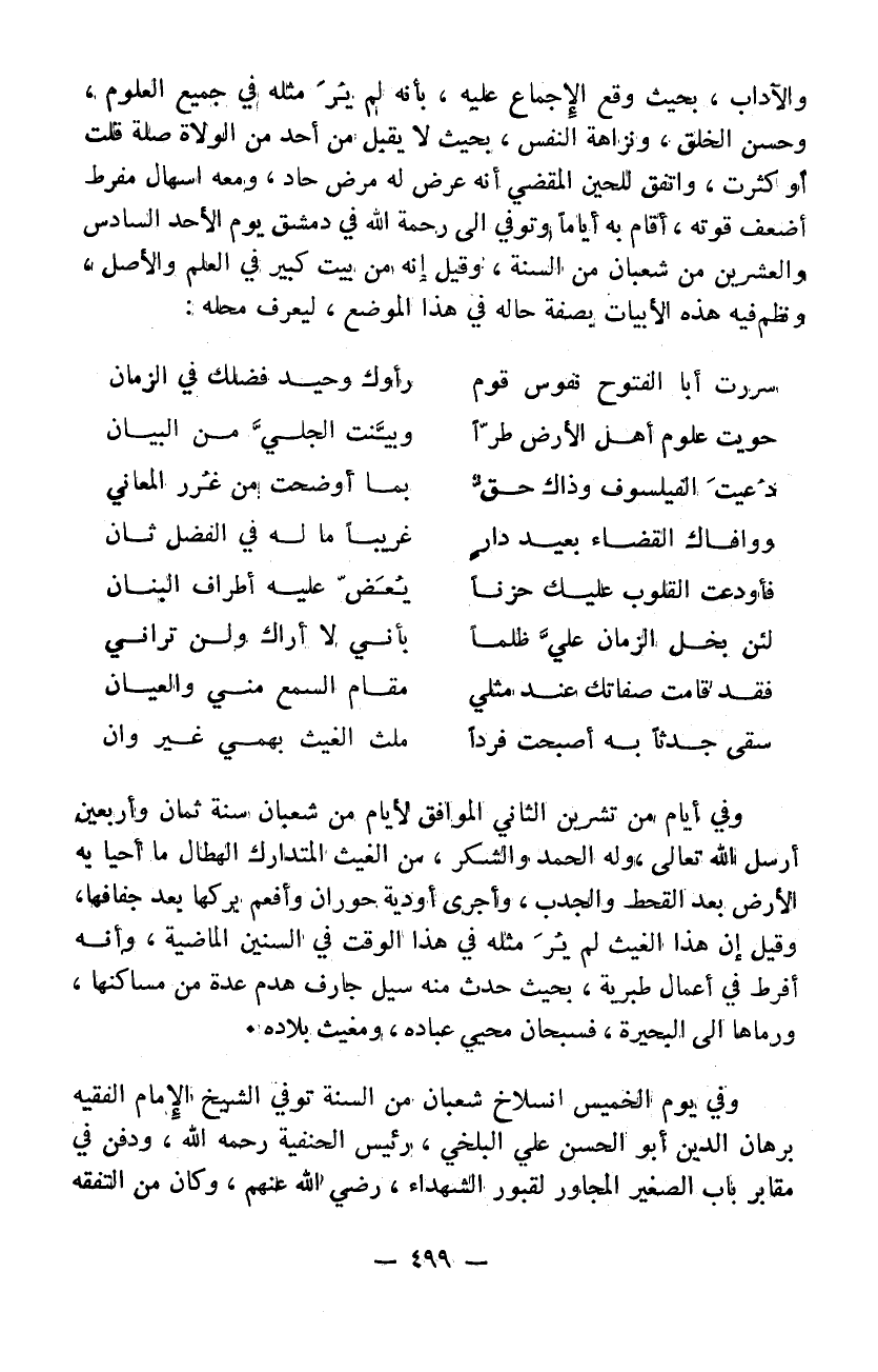 وفي أيام من تشرين الثاني الموافق لأيام من شعبان سنة 48 أرسل الله تعالى وله الحمد والشكر من الغيث المتدارك الهطال ما أحيا به الأرض بعد القحط والجدب وأجرى أودية حوران وأفعم بكرها بعد جفافها وقيل أن هذا الغيث لم ير مثله في هذا الوقت في السنين الماضية وأنه أفرط في أعمال طبرية بحيث حدث منه سيل جارف هدم عدة من مساكنها ورماها إلى البحيرة فسبحان محيي عباده ومغيث بلاده وفي يوم الخميس انسلاخ شعبان من السنة توفي الشيخ الامام الفقيه برهان الدين أبو الحسن علي البلخي رئيس الحنفية رحمه الله ودفن في مقابر باب الصغير المجاور لقبور الشهداء رضي الله عنهم وكان من التفقه