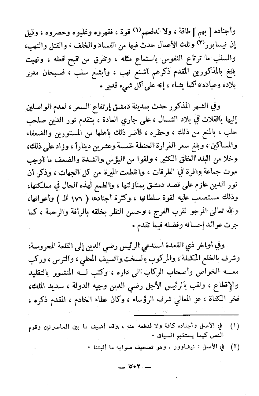 وأجناده طاقة ولا لدفعه عنه قوة فقهروه وغلبوه وحصروه وقيل إن نيسابور وتلك الأعمال حدث فيها من الفساد والخلف والقتل والنهب والسلب ما ترتاع النفوس باستماع مثله وتفرق من قبح فعله ونهبت بلخ بالمذكورين المقدم ذكرهم أشنع نهب وأبشع سلب فسبحان مدبر بلاده وعباده كما يشاء إنه على كل شيء قدير وفي الشهر المذكور حدث بمدينة دمشق ارتفاع السعر لعدم الواصلين إليها بالغلات من بلاد الشمال على جاري العادة بتقدم نور الدين صاحب حلب بالمنع من ذلك وحظره فأضر ذلك بأهلها من المسترين والضعفاء والمساكين وبلغ سعر الغرارة الحنطة خمسة وعشرين ديناراً وزاد على ذلك وخلا من البلد الخلق الكثير ولقوا من البؤس والشدة والضعف ما أوجب موت جماعة وافرة في الطرقات وانقطعت الميرة من كل الجهات وذكر إن نور الدين عازم على قصد دمشق بمنازلتها والطمع لهذه الحال في مملكتها وذلك مستصعب عليه لقوة سلطانها وكثرة أجنادها وأعوانها والله تعالى المرجو لقرب الفرج وحسن النظر بخلقه بالرأفة والرحمة كما جرت عوائد احسانه وفضله فيما تقدم