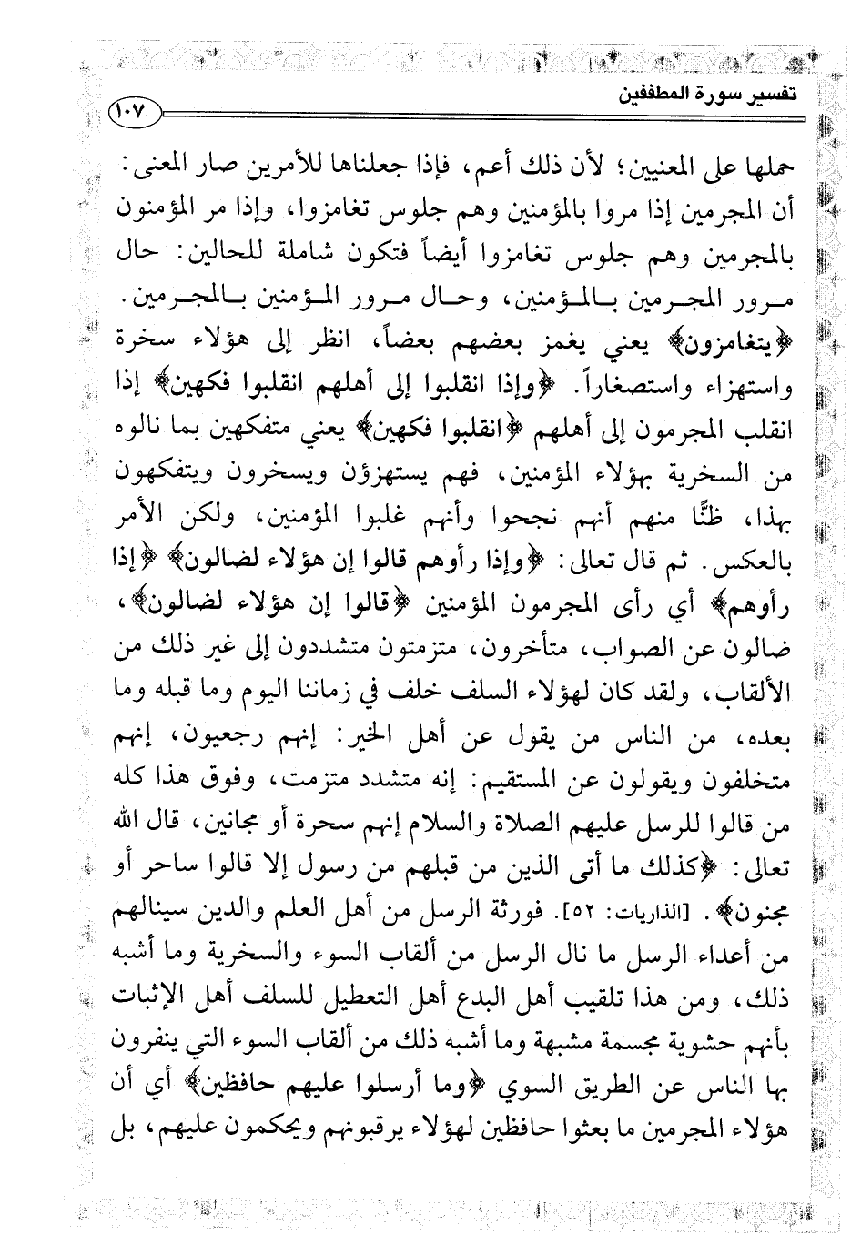 حملها على المعنيين؛ لأن ذلك أعم، فإذا جعلناها للأمرين صار المعنى: أن المجرمين إذا مروا بالمؤمنين وهم جلوس تغامزوا، وإذا مر المؤمنون بالمجرمين وهم جلوس تغامزوا أيضاً فتكون شاملة للحالين: حال مرور المجرمين بالمؤمنين، وحال مرور المؤمنين بالمجرمين. {يتغامزون} يعني يغمز بعضهم بعضاً، انظر إلى هؤلاء سخرة واستهزاء واستصغاراً. {وإذا انقلبوا إلى أهلهم انقلبوا فكهين} إذا انقلب المجرمون إلى أهلهم {انقلبوا فكهين} يعني متفكهين بما نالوه من السخرية بهؤلاء المؤمنين، فهم يستهزؤن ويسخرون ويتفكهون بهذا، ظنًّا منهم أنهم نجحوا وأنهم غلبوا المؤمنين، ولكن الأمر بالعكس. ثم قال تعالى: {وإذا رأوهم قالوا إن هؤلاء لضالون} {إذا رأوهم} أي رأى المجرمون المؤمنين {قالوا إن هؤلاء لضالون} ، ضالون عن الصواب، متأخرون، متزمتون متشددون إلى غير ذلك من الألقاب، ولقد كان لهؤلاء السلف خلف في زماننا اليوم وما قبله وما بعده، من الناس من يقول عن أهل الخير: إنهم رجعيون، إنهم متخلفون ويقولون عن المستقيم: إنه متشدد متزمت، وفوق هذا كله من قالوا للرسل عليهم الصلاة والسلام إنهم سحرة أو مجانين، قال الله تعالى: {كذلك ما أتى الذين من قبلهم من رسول إلا قالوا ساحر أو مجنون} . [الذاريات: 52] .