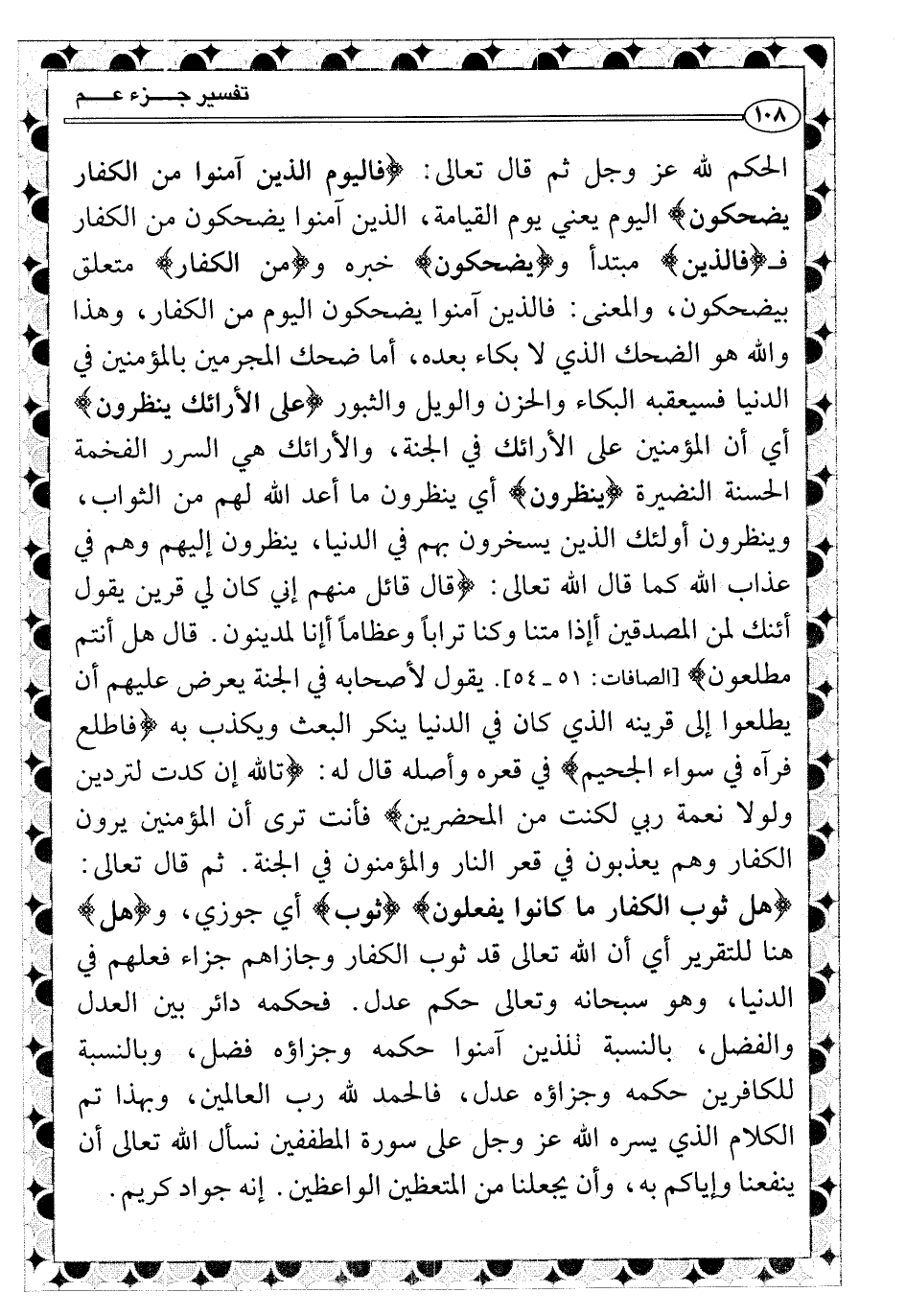 الحكم لله عز وجل ثم قال تعالى: {فاليوم الذين آمنوا من الكفار يضحكون} اليوم يعني يوم القيامة، الذين آمنوا يضحكون من الكفار فـ {فالذين} مبتدأ و {يضحكون} خبره و {من الكفار} متعلق بيضحكون، والمعنى: فالذين آمنوا يضحكون اليوم من الكفار، وهذا والله هو الضحك الذي لا بكاء بعده، أما ضحك المجرمين بالمؤمنين في الدنيا فسيعقبه البكاء والحزن والويل والثبور {على الأرائك ينظرون} أي أن المؤمنين على الأرائك في الجنة، والأرائك هي السرر الفخمة الحسنة النضرة {ينظرون} أي ينظرون ما أعد الله لهم من الثواب، وينظرون أولئك الذين يسخرون بهم في الدنيا، ينظرون إليهم وهم في عذاب الله كما قال الله تعالى: {قال قائل منهم إني كان لي قرين يقول أئنك لمن المصدقين أإذا متنا وكنا تراباً وعظاماً أإنا لمدينون. قال هل أنتم مطلعون} [الصافات: 51 ـ 54] . يقول لأصحابه في الجنة يعرض عليهم أن يطلعوا إلى قرينه الذي كان في الدنيا ينكر البعث ويكذب به {فاطلع فرآه في سواء الجحيم} (الصافات: 55) في قعره وأصله قال له: {تالله إن كدت لتردين ولولا نعمة ربي لكنت من المحضرين} (الصافات: 56 - 67) فأنت ترى أن المؤمنين يرون الكفار وهم يعذبون في قعر النار والمؤمنون في الجنة.