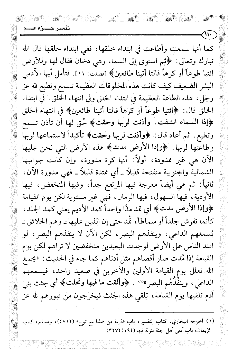 كما أنها سمعت وأطاعت في ابتداء خلقها، ففي ابتداء خلقها قال الله تبارك وتعالى: {ثم استوى إلى السماء وهي دخان فقال لها وللأرض ائتيا طوعاً أو كرهاً قالتا أتينا طائعين} [فصلت: 11] . فتأمل أيها الآدمي البشر الضعيف كيف كانت هذه المخلوقات العظيمة تسمع وتطيع لله عز وجل، هذه الطاعة العظيمة في ابتداء الخلق وفي انتهاء الخلق. في ابتداء الخلق قال: {ائتيا طوعاً أو كرهاً قالتا أتينا طائعين} في انتهاء الخلق {إذا السماء انشقت. وأذنت لربها وحقت} حُق لها أن تأذن تسمع وتطيع. ثم أعاد قال: {وأذنت لربها وحقت} تأكيداً لاستماعها لربها وطاعتها له.