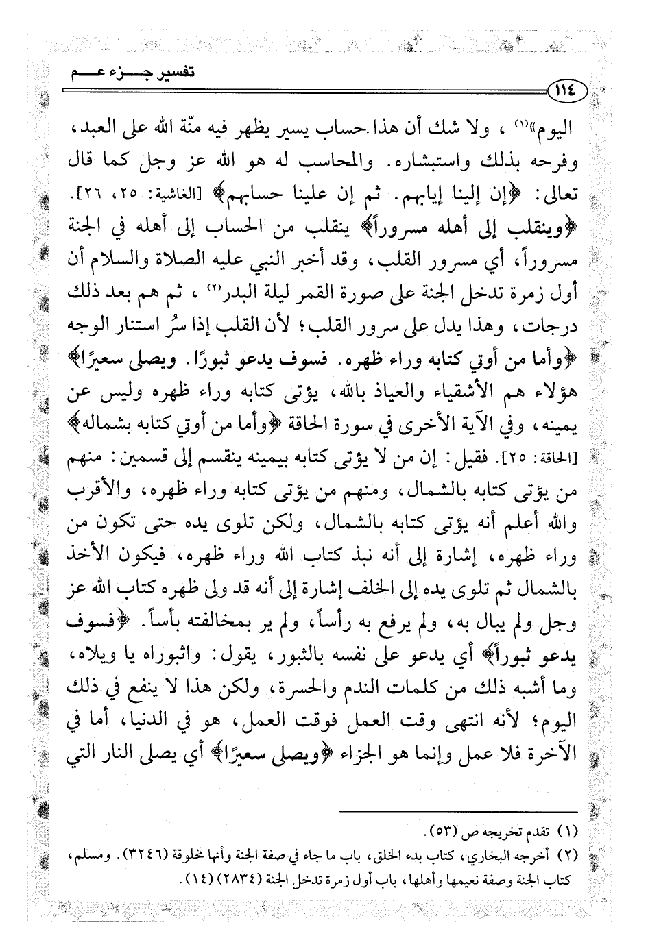 اليوم» (¬1) ، ولا شك أن هذا حساب يسير يظهر فيه منّة الله على العبد، وفرحه بذلك واستبشاره. والمحاسب له هو الله عز وجل كما قال تعالى: {إن إلينا إيابهم. ثم إن علينا حسابهم} [الغاشية: 25، 26] . {وينقلب إلى أهله مسروراً} ينقلب من الحساب إلى أهله في الجنة مسروراً، أي مسرور القلب، وقد أخبر النبي عليه الصلاة والسلام أن أول زمرة تدخل الجنة على صورة القمر ليلة البدر (¬2) ،