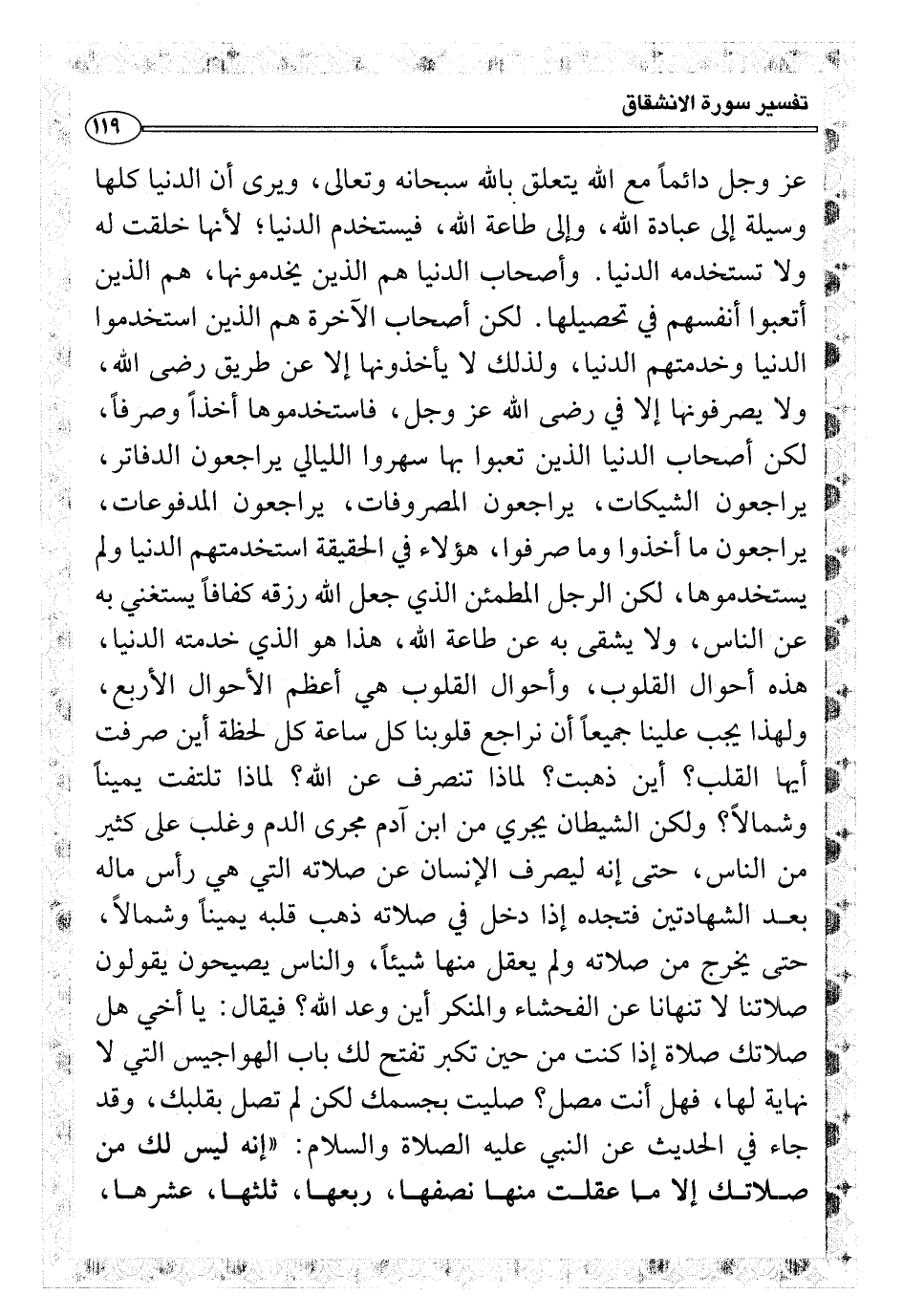 لكن أصحاب الآخرة هم الذين استخدموا الدنيا وخدمتهم الدنيا، ولذلك لا يأخذونها إلا عن طريق رضى الله، ولا يصرفونها إلا في رضى الله عز وجل، فاستخدموها أخذاً وصرفاً، لكن أصحاب الدنيا الذين تعبوا بها سهروا الليالي يراجعون الدفاتر، يراجعون الشيكات، يراجعون المصروفات، يراجعون المدفوعات، يراجعون ما أخذوا وما صرفوا، هؤلاء في الحقيقة استخدمتهم الدنيا ولم يستخدموها، لكن الرجل المطمئن الذي جعل الله رزقه كفافاً يستغني به عن الناس، ولا يشقى به عن طاعة الله، هذا هو الذي خدمته الدنيا، هذه أحوال القلوب، وأحوال القلوب هي أعظم الأحوال الأربع، ولهذا يجب علينا جميعاً أن نراجع قلوبنا كل ساعة كل لحظة أين صرفت أيها القلب؟ أين ذهبت؟ لماذا تنصرف عن الله؟ لماذا تلتفت يميناً وشمالاً؟ ولكن الشيطان يجري من ابن آدم مجرى الدم وقد غلب على كثير من الناس، حتى إن الإنسان ليصرف عن صلاته التي هي رأس ماله بعد الشهادتين فتجده إذا دخل في صلاته ذهب قلبه يميناً وشمالاً، حتى يخرج من صلاته ولم يعقل منها شيئاً، والناس يصيحون يقولون صلاتنا لا تنهانا عن الفحشاء والمنكر أين وعد الله؟ فيقال: يا أخي هل صلاتك صلاة إذا كنت من حين تكبر تفتح لك باب الهواجيس التي لا نهاية لها، فهل أنت مصل؟ صليت بجسمك لكن لم تصل بقلبك، ويقال لمثل هؤلاء: إن الصلاة التي تنهى عن الفحشاء والمنكر هي الصلاة التي يعقل فيها صاحبها ما يقرأه من القرآن والأذكار والتسبيح والأدعية ويحافظ على ركوعها وسجودها وخشوعها وطمأنينتها أما الصلاة التي يهيم فيها القلب في كل واد ويخرج منها ولم يدر ما قرأ فلا تنهى عن الفحشاء والمنكر من أجل ذلك أخبر رسول الله صلى الله عليه وسلم: «إنه ليس لك من صلاتك إلا ما عقلت منها نصفها، ربعها، ثلثها، عشرها،