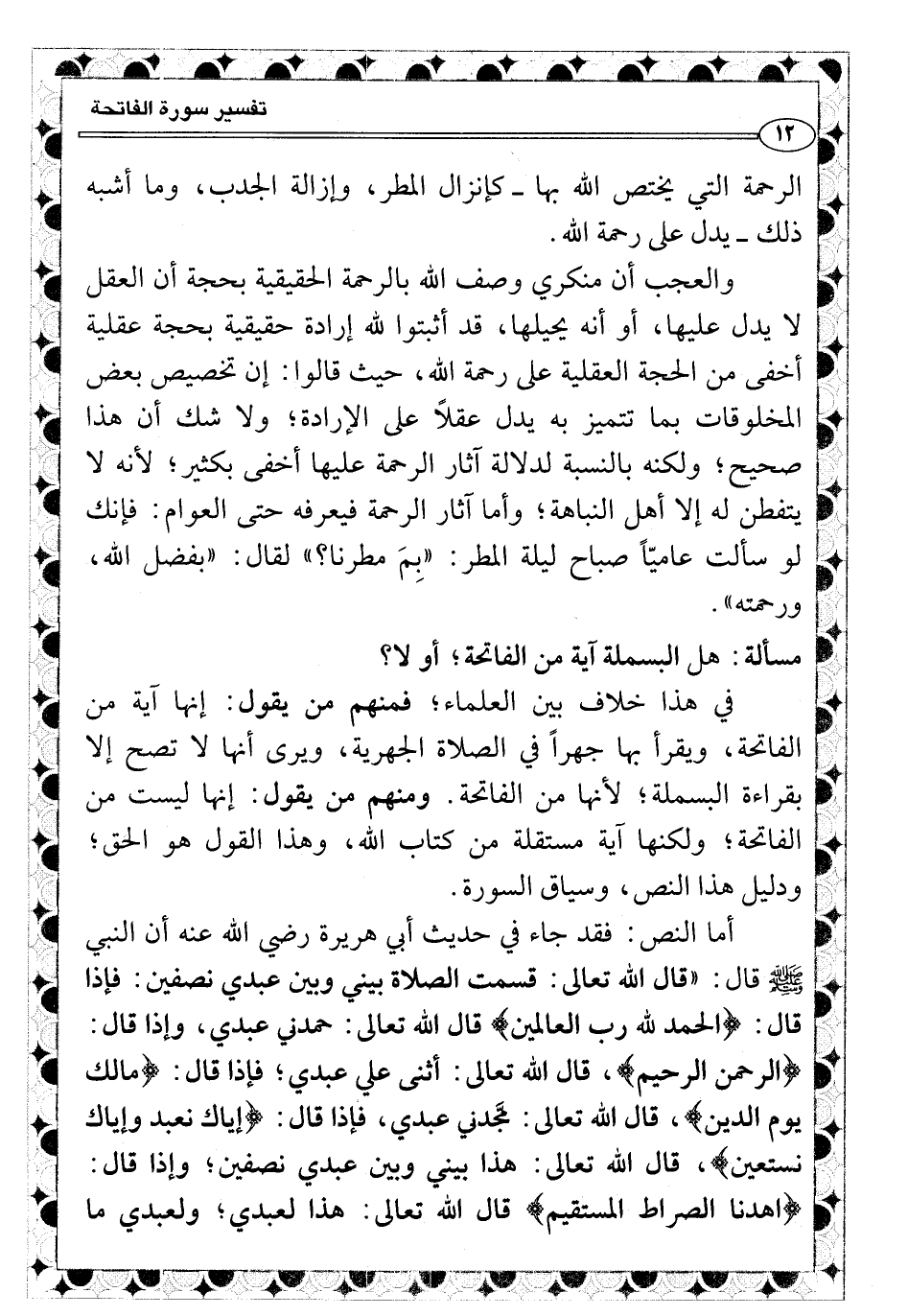 أما النص: فقد جاء في حديث أبي هريرة رضي الله عنه أن النبي صلى الله عليه وسلّم قال: «قال الله تعالى: قسمت الصلاة بيني وبين عبدي نصفين: فإذا قال: {الحمد لله رب العالمين} قال الله تعالى: حمدني عبدي، وإذا قال: {الرحمن الرحيم} ، قال الله تعالى: أثنى علي عبدي؛ فإذا قال: {مالك يوم الدين} ، قال الله تعالى: مَّجدني عبدي، فإذا قال: {إياك نعبد وإياك نستعين} ، قال الله تعالى: هذا بيني وبين عبدي نصفين؛ وإذا قال: {اهدنا الصراط المستقيم} قال الله تعالى: هذا لعبدي؛ ولعبدي ما