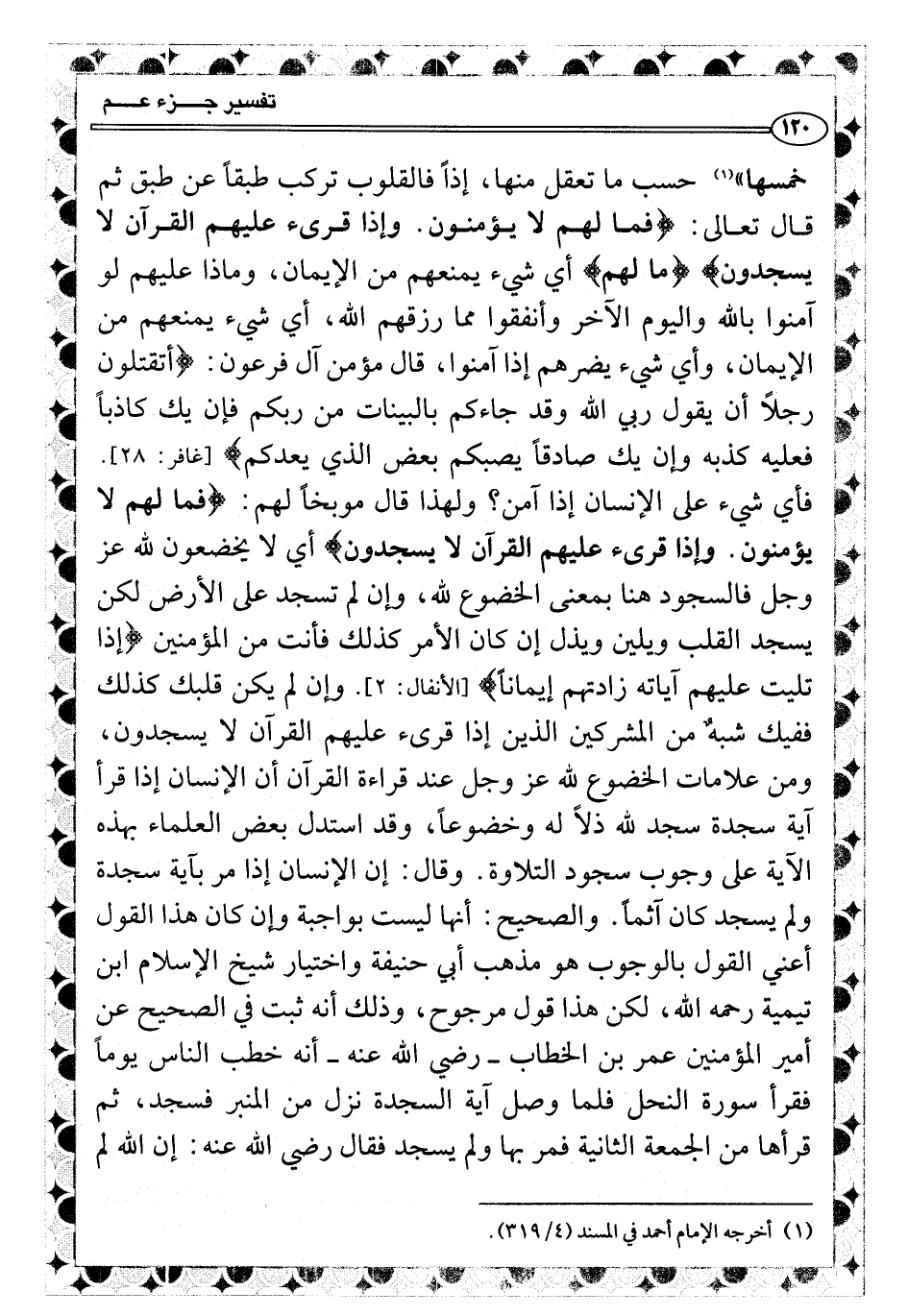 حسب ما تعقل منها، إذاً فالقلوب تركب طبقاً عن طبق ثم قال تعالى: {فما لهم لا يؤمنون. وإذا قرىء عليهم القرآن لا يسجدون} {ما لهم} أي شيء يمنعهم من الإيمان، وماذا عليهم لو آمنوا بالله واليوم الآخر وأنفقوا مما رزقهم الله، أي شيء يمنعهم من الإيمان، وأي شيء يضرهم إذا آمنوا، قال مؤمن آل فرعون: {أتقتلون رجلاً أن يقول ربي الله وقد جاءكم بالبينات من ربكم وإن يك كاذباً فعليه كذبه وإن يك صادقاً يصبكم بعض الذي يعدكم} [غافر: 28] . فأي شيء على الإنسان إذا آمن؟ ولهذا قال موبخاً لهم: {فما لهم لا يؤمنون. وإذا قرىء عليهم القرآن لا يسجدون} أي لا يخضعون لله عز وجل فالسجود هنا بمعنى الخضوع لله، وإن لم تسجد على الأرض لكن يسجد القلب ويلين ويذل، إن كان الأمر كذلك فأنت من المؤمنين {إذا تليت عليهم آياته زادتهم إيماناً} [الأنفال: 2] . وإن لم يكن قلبك كذلك ففيك شبهٌ من المشركين الذين إذا قرىء عليهم القرآن لا يسجدون، ومن علامات الخضوع لله عز وجل عند قراءة القرآن أن الإنسان إذا قرأ آية سجدة سجد لله ذلاً له وخضوعاً، وقد استدل بعض العلماء بهذه الآية على وجوب سجود التلاوة. وقال: إن الإنسان إذا مر بآية سجدة ولم يسجد كان آثماً. والصحيح: أنها ليست بواجبة وإن كان هذا القول أعني القول بالوجوب هو مذهب أبي حنيفة واختيار شيخ الإسلام ابن تيمية رحمه الله، لكن هذا قول مرجوح، وذلك أنه ثبت في الصحيح عن أمير المؤمنين عمر بن الخطاب ـ رضي الله عنه ـ أنه خطب الناس يوماً فقرأ سورة النحل فلما وصل آية السجدة نزل من المنبر فسجد، ثم قرأها من الجمعة الثانية فمر بها ولم يسجد فقال رضي الله عنه: إن الله لم