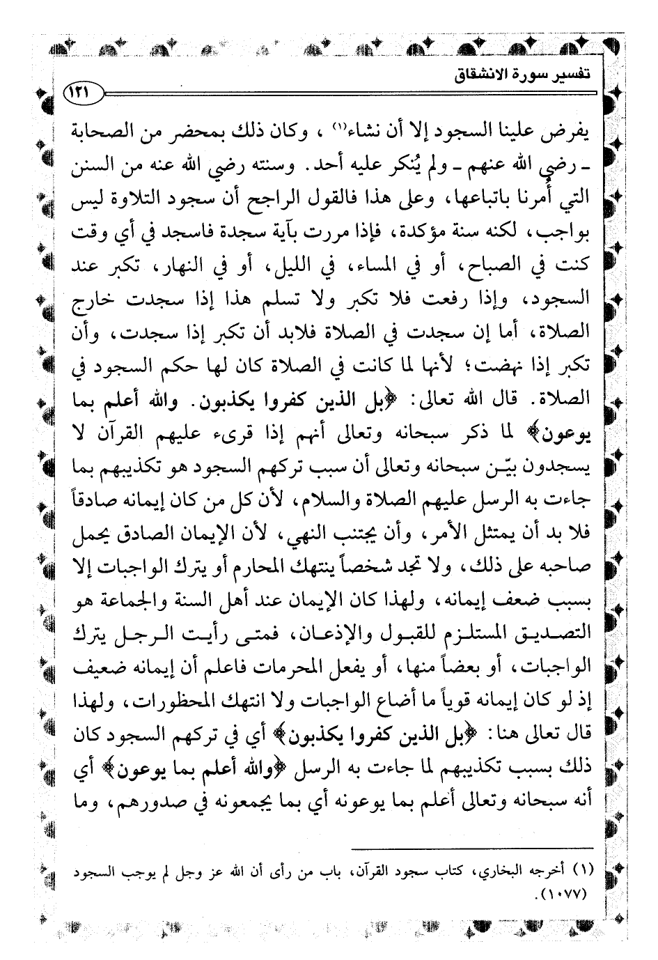 وكان ذلك بمحضر من الصحابة ـ رضي الله عنهم ـ ولم يُنكر عليه أحد. وسنته رضي الله عنه من السنن التي أُمرنا باتباعها، وعلى هذا فالقول الراجح أن سجود التلاوة ليس بواجب، لكنه سنة مؤكدة، فإذا مررت بآية سجدة فاسجد في أي وقت كنت في الصباح، أو في المساء، في الليل، أو في النهار، تكبر عند السجود، وإذا رفعت فلا تكبر ولا تسلم هذا إذا سجدت خارج الصلاة، أما إن سجدت في الصلاة فلابد أن تكبر إذا سجدت، وأن تكبر إذا نهضت؛ لأنها لما كانت في الصلاة كان لها حكم السجود في الصلاة. قال الله تعالى: {بل الذين كفروا يكذبون.