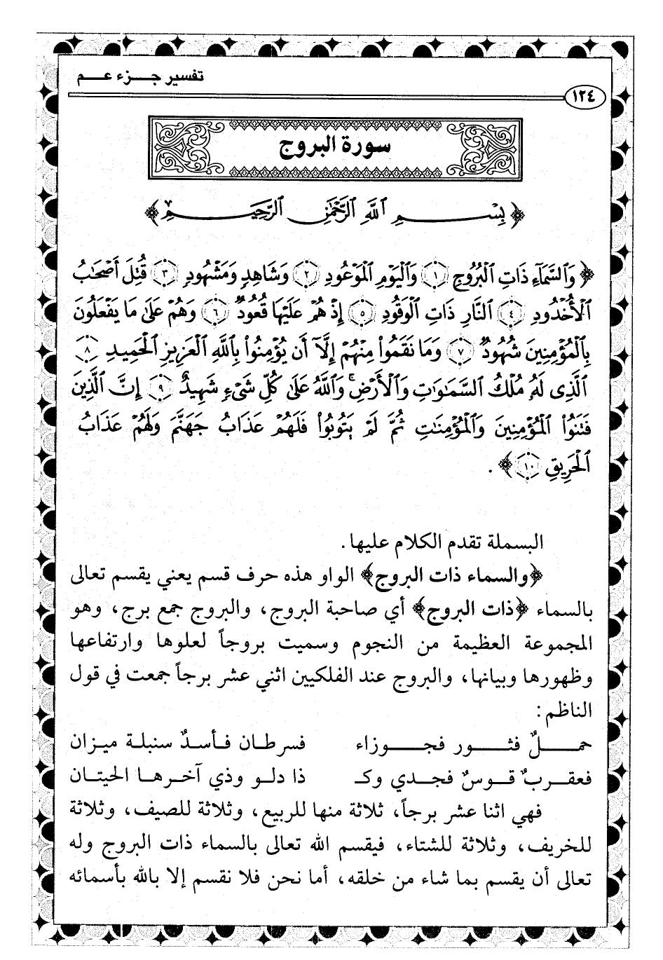 {والسماء ذات البروج} الواو هذه حرف قسم يعني يقسم تعالى بالسماء {ذات البروج} أي صاحبة البروج، والبروج جمع برج، وهو المجموعة العظيمة من النجوم وسميت بروجاً لعلوها وارتفاعها وظهورها وبيانها، والبروج عند الفلكيين اثني عشر برجاً جمعت في قول الناظم: