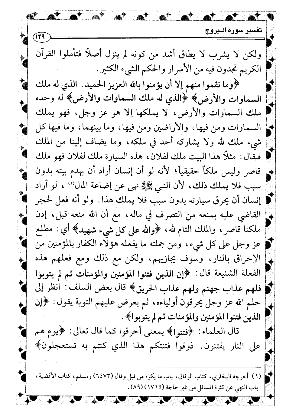 وما يضاف إلينا من الملك فيقال: مثلاً هذا البيت ملك لفلان، هذه السيارة ملك لفلان فهو ملك قاصر وليس ملكاً حقيقياً؛ لأنه لو أن إنسان أراد أن يهدم بيته بدون سبب فلا يملك ذلك، لأن النبي صلى الله عليه وسلّم نهى عن إضاعة المال (¬1) ، لو أراد إنسان أن يحرق سيارته بدون سبب فلا يملك هذا. ولو أنه فعل لحجر القاضي عليه بمنعه من التصرف في ماله، مع أن الله منعه قبل، إذن ملكنا قاصر، والملك التام لله، {والله على كل شيء شهيد} أي: مطلع عز وجل على كل شيء، ومن جملته ما يفعله هؤلاء الكفار بالمؤمنين من الإحراق بالنار، وسوف يجازيهم، ولكن مع ذلك ومع فعلهم هذه الفعلة الشنيعة قال: {إن الذين فتنوا المؤمنين والمؤمنات ثم لم يتوبوا فلهم عذاب جهنم ولهم عذاب الحريق} قال بعض السلف: انظر إلى حلم الله عز وجل يحرقون أولياءه، ثم يعرض عليهم التوبة يقول: {إن الذين فتنوا المؤمنين والمؤمنات ثم لم يتوبوا} .