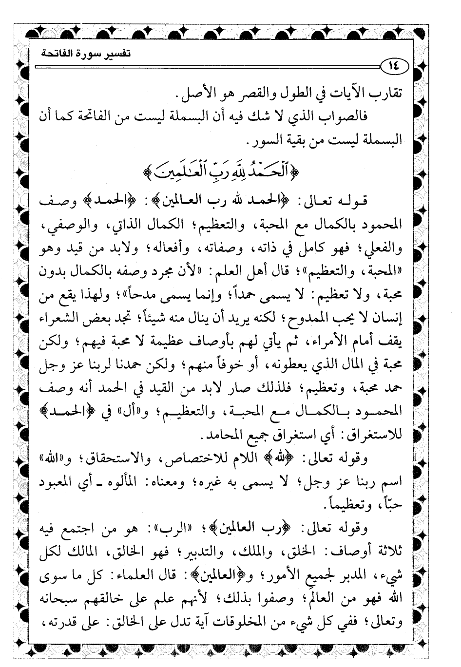 قوله تعالى: {الحمد لله رب العالمين} : {الحمد} وصف المحمود بالكمال مع المحبة، والتعظيم؛ الكمال الذاتي، والوصفي، والفعلي؛ فهو كامل في ذاته، وصفاته، وأفعاله؛ ولابد من قيد وهو «المحبة، والتعظيم» ؛ قال أهل العلم: «لأن مجرد وصفه بالكمال بدون محبة، ولا تعظيم: لا يسمى حمداً؛ وإنما يسمى مدحاً» ؛ ولهذا يقع من إنسان لا يحب الممدوح؛ لكنه يريد أن ينال منه شيئاً؛ تجد بعض الشعراء يقف أمام الأمراء، ثم يأتي لهم بأوصاف عظيمة لا محبة فيهم؛ ولكن محبة في المال الذي يعطونه، أو خوفاً منهم؛ ولكن حمدنا لربنا عز وجل حمد محبة، وتعظيم؛ فلذلك صار لابد من القيد في الحمد أنه وصف المحمود بالكمال مع المحبة، والتعظيم؛ و «أل» في {الحمد} للاستغراق: أي استغراق جميع المحامد.
