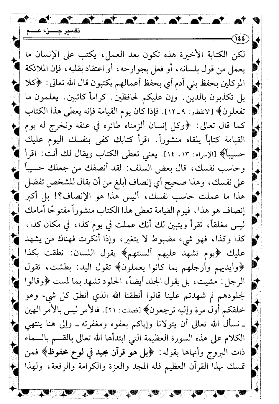 لكن الكتابة الأخيرة هذه تكون بعد العمل، يكتب على الإنسان ما يعمل من قول بلسانه، أو فعل بجوارحه، أو اعتقاد بقلبه، فإن الملائكة الموكلين بحفظ بني آدم أي بحفظ أعمالهم يكتبون قال الله تعالى: {كلا بل تكذبون بالدين. وإن عليكم لحافظين. كراماً كاتبين. يعلمون ما تفعلون} [الانفطار: 9 ـ 12] . فإذا كان يوم القيامة فإنه يعطى هذا الكتاب كما قال تعالى: {وكل إنسان ألزمناه طائره في عنقه ونخرج له يوم القيامة كتاباً يلقاه منشوراً. اقرأ كتابك كفى بنفسك اليوم عليك حسيباً} [الإسراء: 13، 14] . يعني تعطى الكتاب ويقال لك أنت: اقرأ وحاسب نفسك، قال بعض السلف: لقد أنصفك من جعلك حسيباً على نفسك، وهذا صحيح أي إنصاف أبلغ من أن يقال للشخص تفضل هذا ما عملت حاسب نفسك، أليس هذا هو الإنصاف؟! بل أكبر إنصاف هو هذا، فيوم القيامة تعطى هذا الكتاب منشوراً مفتوحًا أمامك ليس مغلقاً، تقرأ ويتبين لك أنك عملت في يوم كذا، في مكان كذا، كذا وكذا، فهو شيء مضبوط لا يتغير، وإذا أنكرت فهناك من يشهد عليك {يوم تشهد عليهم ألسنتهم} يقول اللسان: نطقت بكذا {وأيديهم وأرجلهم بما كانوا يعملون} {النور: 24} تقول اليد: بطشت، تقول الرجل: مشيت، بل يقول الجلد أيضاً، الجلود تشهد بما لمست {وقالوا لجلودهم لم شهدتم علينا قالوا أنطقنا الله الذي أنطق كل شيء وهو خلقكم أول مرة وإليه ترجعون} [فصلت: 21] .