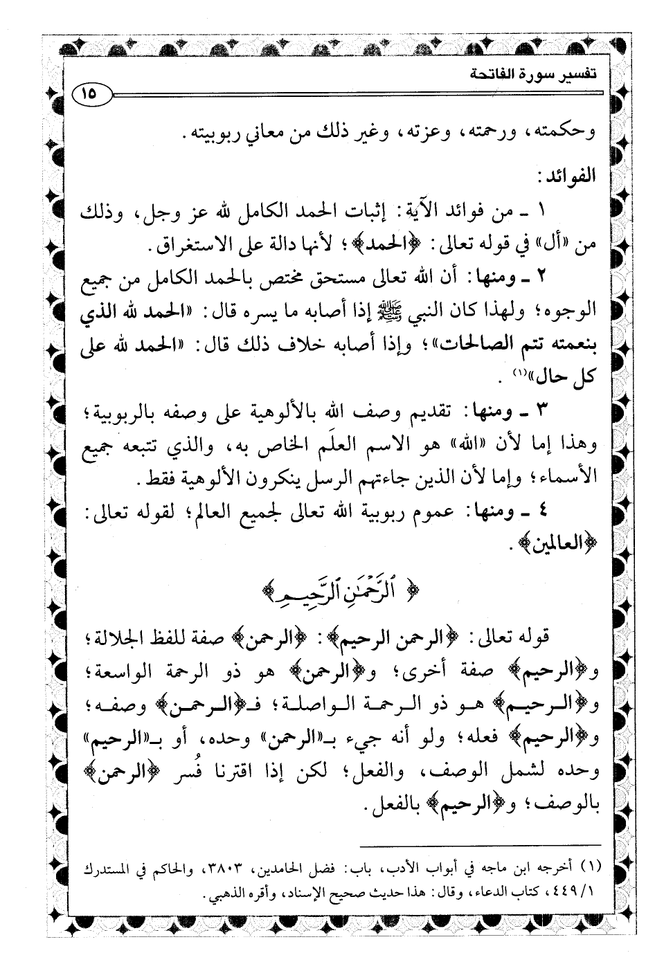 2 ـ ومنها: أن الله تعالى مستحق مختص بالحمد الكامل من جميع الوجوه؛ ولهذا كان النبي صلى الله عليه وسلّم إذا أصابه ما يسره قال: «الحمد لله الذي بنعمته تتم الصالحات» ؛ وإذا أصابه خلاف ذلك قال: «الحمد لله على كل حال» (¬1) .
