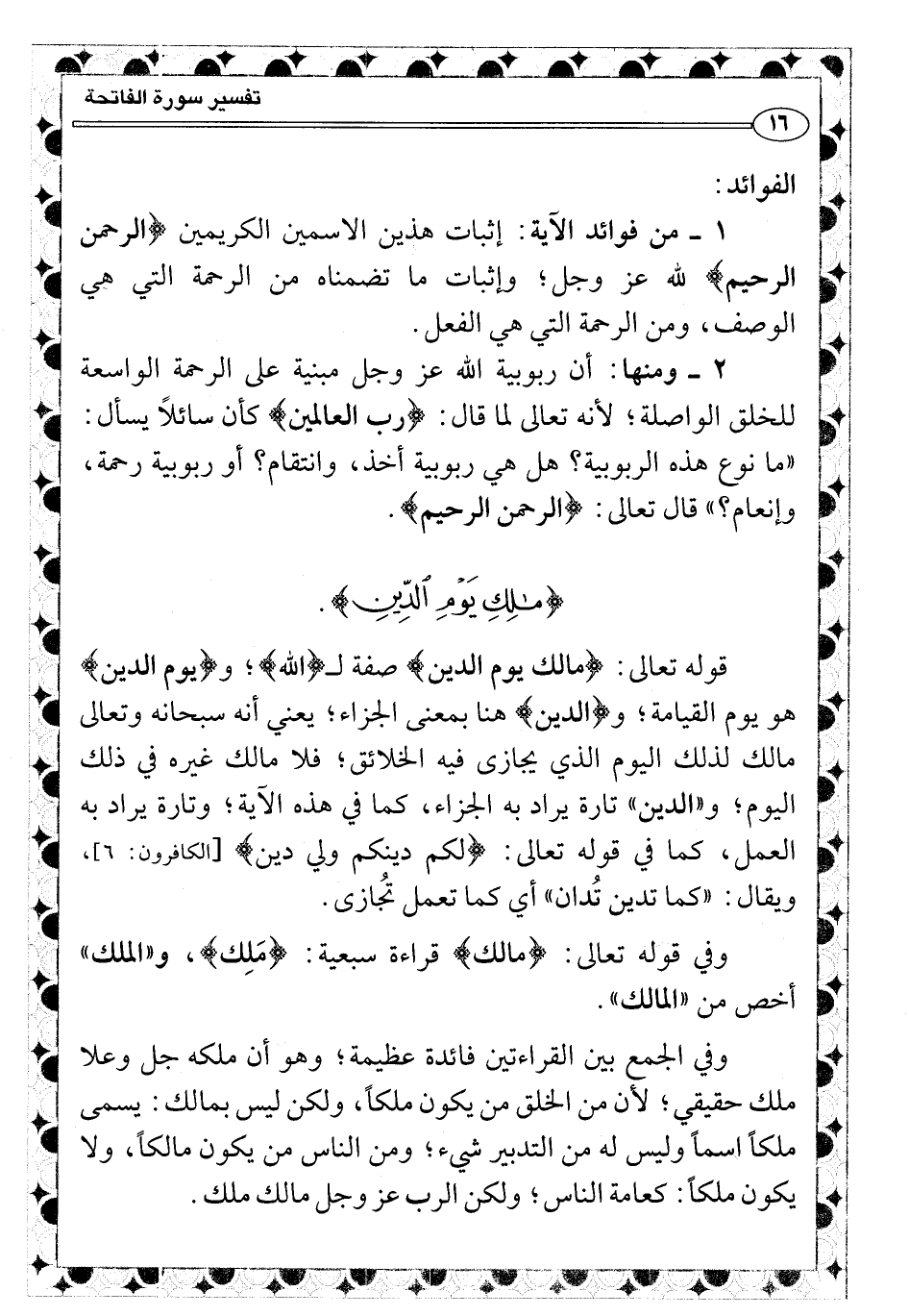 قوله تعالى: {مالك يوم الدين} صفة لـ {الله} ؛ و {يوم الدين} هو يوم القيامة؛ و {الدين} هنا بمعنى الجزاء؛ يعني أنه سبحانه وتعالى مالك لذلك اليوم الذي يجازى فيه الخلائق؛ فلا مالك غيره في ذلك اليوم؛ و «الدين» تارة يراد به الجزاء، كما في هذه الآية؛ وتارة يراد به العمل، كما في قوله تعالى: {لكم دينكم ولي دين} [الكافرون: 6] ، ويقال: «كما تدين تُدان» أي كما تعمل تُجازى.