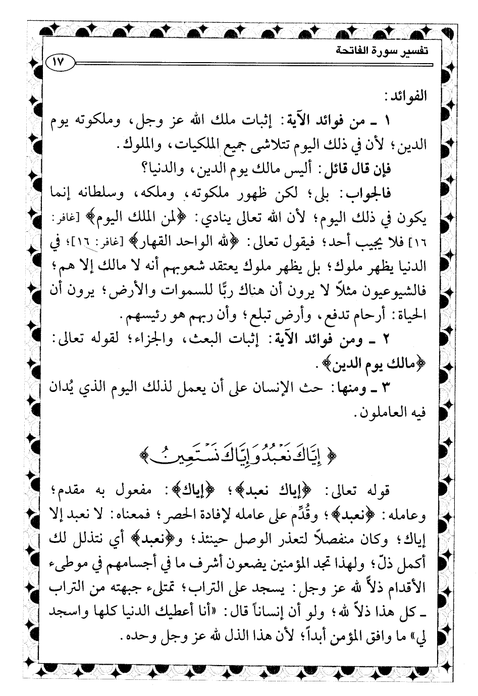 قوله تعالى: {إياك نعبد} ؛ {إياك} : مفعول به مقدم؛ وعامله: {نعبد} ؛ وقُدِّم على عامله لإفادة الحصر؛ فمعناه: لا نعبد إلا إياك؛ وكان منفصلاً لتعذر الوصل حينئذ؛ و {نعبد} أي نتذلل لك أكمل ذلّ؛ ولهذا تجد المؤمنين يضعون أشرف ما في أجسامهم في موطىء الأقدام ذلاًّ لله عز وجل: يسجد على التراب؛ تمتلىء جبهته من التراب ـ كل هذا ذلاً لله؛ ولو أن إنساناً قال: «أنا أعطيك الدنيا كلها واسجد لي» ما وافق المؤمن أبداً؛ لأن هذا الذل لله عز وجل وحده.