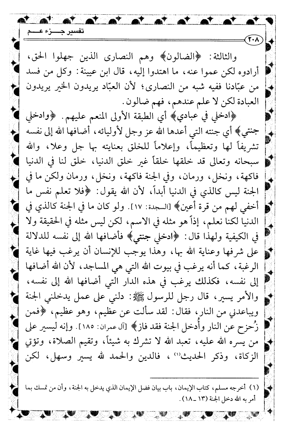 {ادخلي في عبادي} أي الطبقة الأولى المنعم عليهم. {وادخلي جنتي} أي جنته التي أعدها الله عز وجل لأوليائه، أضافها الله إلى نفسه تشريفاً لها وتعظيماً، وإعلاماً للخلق بعنايته بها جل وعلا، والله سبحانه وتعالى قد خلقها خلقاً غير خلق الدنيا، خلق لنا في الدنيا فاكهةً، ونخلاً، ورماناً، وفي الجنة فاكهة، ونخل، ورمان ولكن ما في الجنة ليس كالذي في الدنيا أبداً، لأن الله يقول: {فلا تعلم نفس ما أخفي لهم من قرة أعين} [السجدة: 17] . ولو كان ما في الجنة كالذي في الدنيا لكنا نعلم، إذاً هو مثله في الاسم، لكن ليس مثله في الحقيقة ولا في الكيفية ولهذا قال: {ادخلي جنتي} فأضافها الله إلى نفسه للدلالة على شرفها وعناية الله بها، وهذا يوجب للإنسان أن يرغب فيها غاية الرغبة، كما أنه يرغب في بيوت الله التي هي المساجد، لأن الله أضافها إلى نفسه، فكذلك يرغب في هذه الدار التي أضافها الله إلى نفسه، والأمر يسير، قال رجل للرسول صلى الله عليه وسلّم: دلني على عمل يدخلني الجنة ويباعدني من النار، فقال: لقد سألت عن عظيم، وهو عظيم، {فمن زُحزح عن النار وأُدخل الجنة فقد فاز} [آل عمران: 185] . وإنه ليسير على من يسره الله عليه، تعبد الله لا تشرك به شيئاً، وتقيم الصلاة، وتؤتي الزكاة، وذكر الحديث (¬1) ،