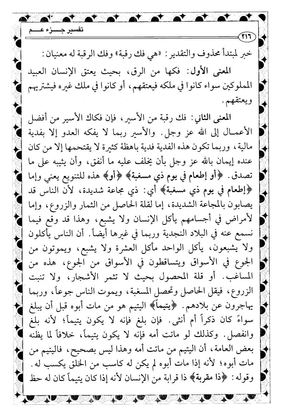 المعنى الثاني: فك رقبة من الأسير، فإن فكاك الأسير من أفضل الأعمال إلى الله عز وجل. والأسير ربما لا يفكه العدو إلا بفدية مالية، وربما تكون هذه الفدية فدية باهظة كثيرة لا يقتحمها إلا من كان عنده إيمان بالله عز وجل بأن يخلف عليه ما أنفق، وأن يثيبه على ما تصدق. {أو إطعام في يوم ذي مسغبة} {أو} هذه للتنويع يعني وإما {إطعام في يوم ذي مسغبة} أي: ذي مجاعة شديدة، لأن الناس قد يصابون بالمجاعة الشديدة، إما لقلة الحاصل من الثمار والزروع، وإما لأمراض في أجسامهم يأكل الإنسان ولا يشبع، وهذا قد وقع فيما نسمع عنه في البلاد النجدية وربما في غيرها أيضاً. أن الناس يأكلون ولا يشبعون، يأكل الواحد مأكل العشرة ولا يشبع، ويموتون من الجوع في الأسواق ويتساقطون في الأسواق من الجوع، هذه من المساغب. أو قلة المحصول بحيث لا تثمر الأشجار، ولا تنبت الزروع، فيقل الحاصل وتحصل المسغبة، ويموت الناس جوعاً، وربما يهاجرون عن بلادهم. {يتيماً} اليتيم هو من مات أبوه قبل أن يبلغ سواءً كان ذكراً أم أنثى. فإن بلغ فإنه لا يكون يتيماً؛ لأنه بلغ وانفصل. وكذلك لو ماتت أمه فإنه لا يكون يتيماً، خلافاً لما يظنه بعض العامة، أن اليتيم من ماتت أمه وهذا ليس بصحيح، فاليتيم من مات أبوه؛ لأنه إذا مات أبوه لم يكن له كاسب من الخلق يكسب له. وقوله: {ذا مقربة} ذا قرابة من الإنسان لأنه إذا كان يتيماً كان له حظ