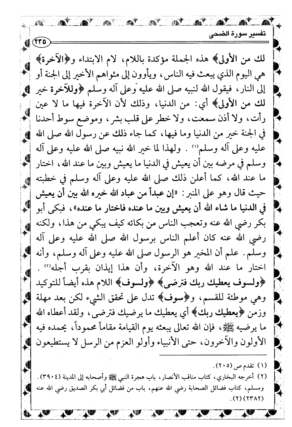 لك من الأولى} هذه الجملة مؤكدة باللام، لام الابتداء و {الآخرة} هي اليوم الذي يبعث فيه الناس، ويأوون إلى مثواهم الأخير إلى الجنة أو إلى النار، فيقول الله لنبيه صلى الله عليه وعلى آله وسلم {وللآخرة خير لك من الأولى} أي: من الدنيا، وذلك لأن الآخرة فيها ما لا عين رأت، ولا أذن سمعت، ولا خطر على قلب بشر، وموضع سوط أحدنا في الجنة خير من الدنيا وما فيها، كما جاء ذلك عن رسول الله صلى الله عليه وعلى آله وسلم (¬1) . ولهذا لما خير الله نبيه صلى الله عليه وعلى آله وسلم في مرضه بين أن يعيش في الدنيا ما يعيش وبين ما عند الله، اختار ما عند الله، كما أعلن ذلك صلى الله عليه وعلى آله وسلم في خطبته حيث قال وهو على المنبر: «إن عبداً من عباد الله خيره الله بين أن يعيش في الدنيا ما شاء الله أن يعيش وبين ما عنده فاختار ما عنده» ، فبكى أبو بكر رضي الله عنه وتعجب الناس من بكائه كيف يبكي من هذا، ولكنه رضي الله عنه كان أعلم الناس برسول الله صلى الله عليه وعلى آله وسلم. علم أن المخير هو الرسول صلى الله عليه وعلى آله وسلم، وأنه اختار ما عند الله وهو الآخرة، وأن هذا إيذان بقرب أجله. (¬2)