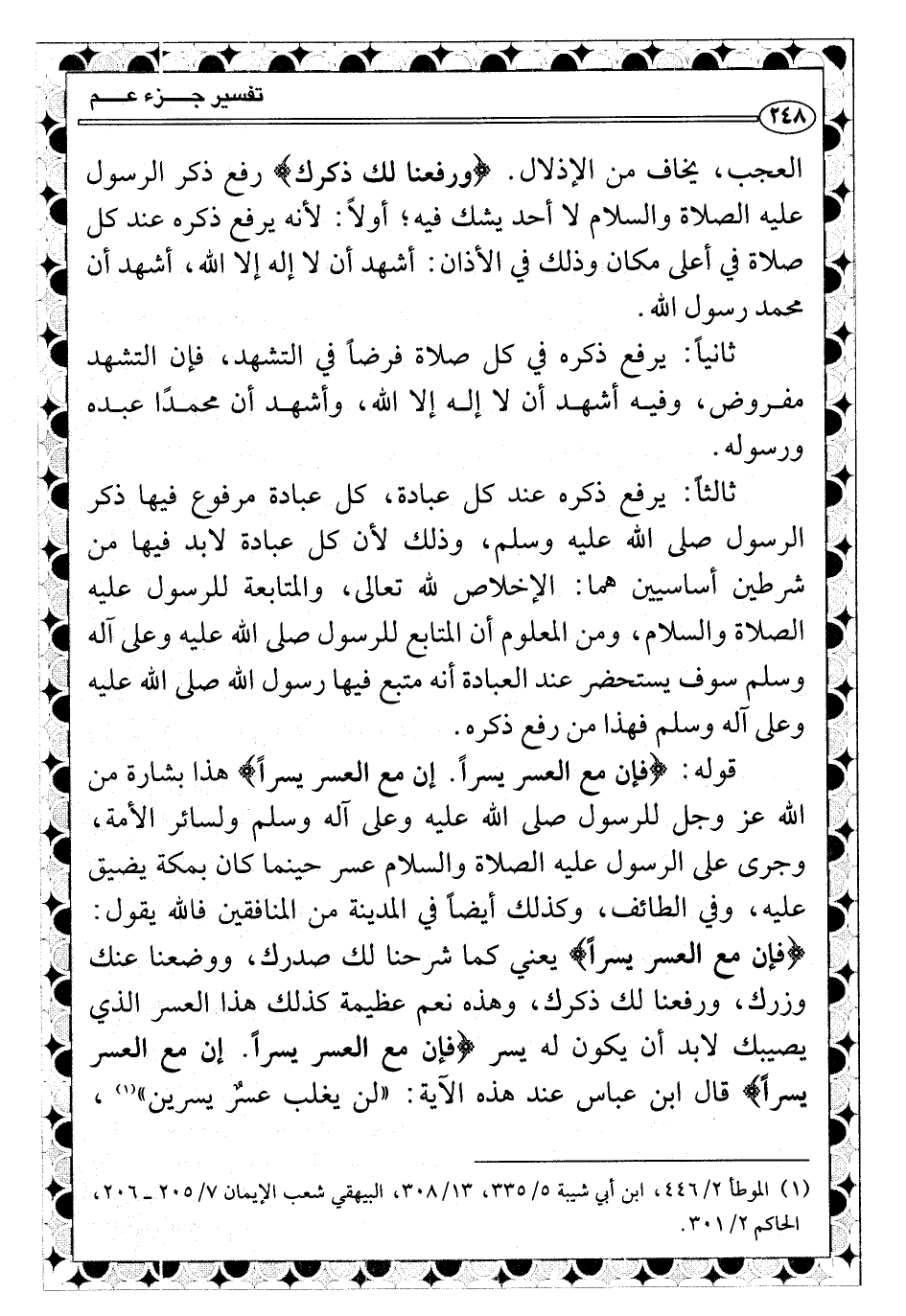 قوله: {فإن مع العسر يسراً. إن مع العسر يسراً} هذا بشارة من الله عز وجل للرسول صلى الله عليه وعلى آله وسلم ولسائر الأمة، وجرى على الرسول عليه الصلاة والسلام عسر حينما كان بمكة يضيق عليه، وفي الطائف، وكذلك أيضاً في المدينة من المنافقين فالله يقول: {فإن مع العسر يسراً} يعني كما شرحنا لك صدرك، ووضعنا عنك وزرك، ورفعنا لك ذكرك، وهذه نعم عظيمة كذلك هذا العسر الذي يصيبك لابد أن يكون له يسر {فإن مع العسر يسراً. إن مع العسر يسراً} قال ابن عباس عند هذه الآية: «لن يغلب عسٌر يسرين» (¬1) ،