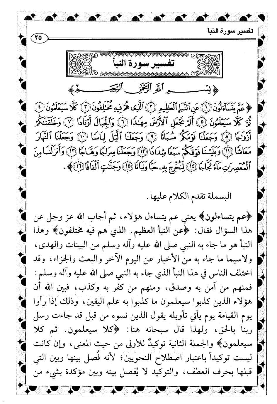 {عم يتساءلون} يعني عم يتساءل هؤلاء، ثم أجاب الله عز وجل عن هذا السؤال فقال: {عن النبأ العظيم. الذي هم فيه مختلفون} وهذا النبأ هو ما جاء به النبي صلى الله عليه وآله وسلم من البينات والهدى، ولاسيما ما جاء به من الأخبار عن اليوم الآخر والبعث والجزاء، وقد اختلف الناس في هذا النبأ الذي جاء به النبي صلى الله عليه وآله وسلم: فمنهم من آمن به وصدق، ومنهم من كفر به وكذب، ومنهم من شك فيه وتردد فبين الله أن هؤلاء الذين كذبوا سيعلمون ما كذبوا به علم اليقين، وذلك إذا رأوا يوم القيامة يوم يأتي تأويله يقول الذين نسوه من قبل قد جاءت رسل ربنا بالحق، ولهذا قال سبحانه هنا: {كلا سيعلمون. ثم كلا سيعلمون} والجملة الثانية توكيدٌ للأولى من حيث المعنى، وإن كانت ليست توكيداً باعتبار اصطلاح النحويين؛ لأنه فُصل بينها وبين التي قبلها بحرف العطف، والتوكيد لا يُفصل بينه وبين مؤكدة بشيء من