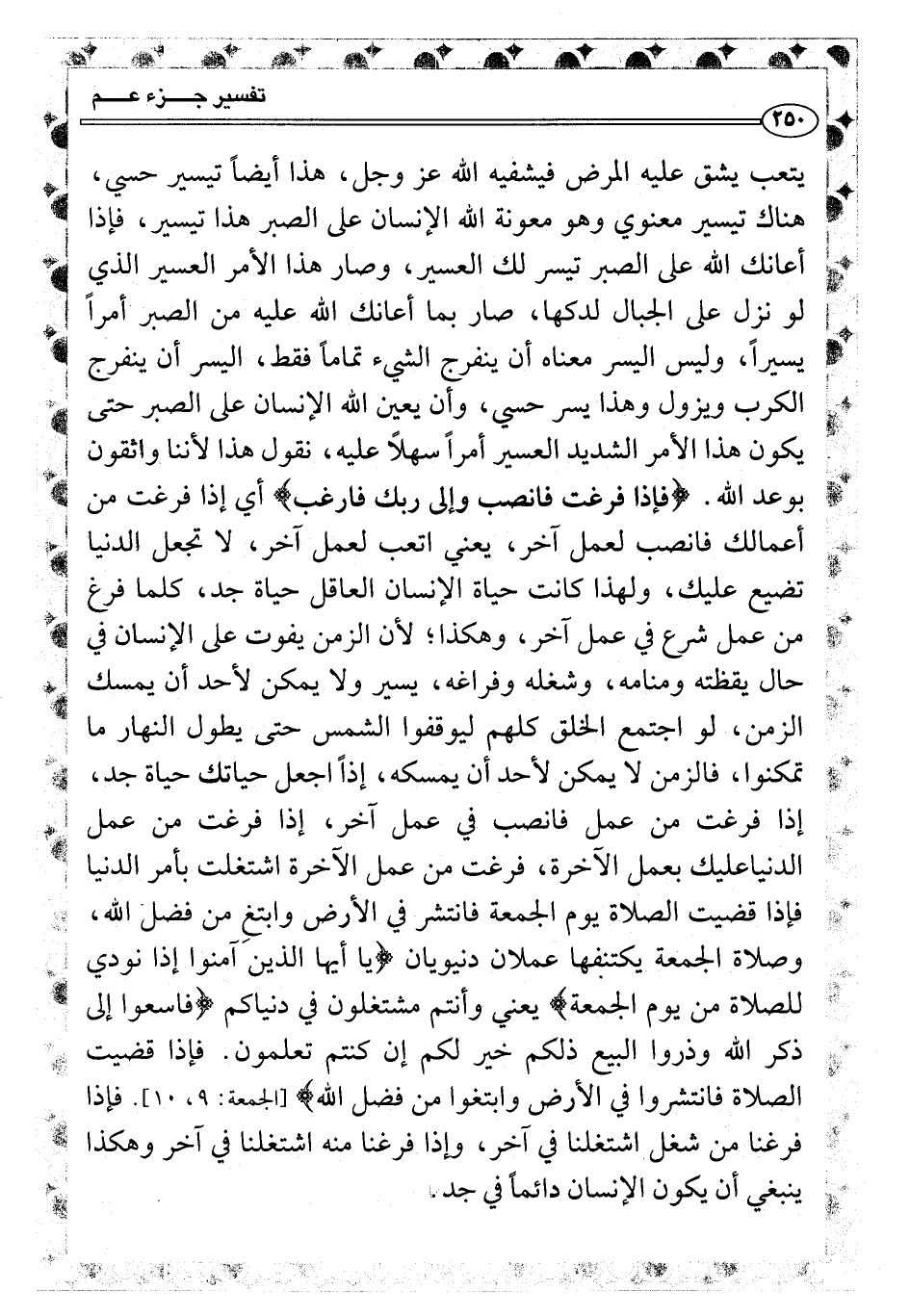 يتعب يشق عليه المرض فيشفيه الله عز وجل، هذا أيضاً تيسير حسي، هناك تيسير معنوي وهو معونة الله الإنسان على الصبر هذا تيسير، فإذا أعانك الله على الصبر تيسر لك العسير، وصار هذا الأمر العسير الذي لو نزل على الجبال لدكها، صار بما أعانك الله عليه من الصبر أمراً يسيراً، وليس اليسر معناه أن ينفرج الشيء تماماً فقط، اليسر أن ينفرج الكرب ويزول وهذا يسر حسي، وأن يعين الله الإنسان على الصبر حتى يكون هذا الأمر الشديد العسير أمراً سهلاً عليه، نقول هذا لأننا واثقون بوعد الله. {فإذا فرغت فانصب وإلى ربك فارغب} أي إذا فرغت من أعمالك فانصب لعمل آخر، يعني اتعب لعمل آخر، لا تجعل الدنيا تضيع عليك، ولهذا كانت حياة الإنسان العاقل حياة جد، كلما فرغ من عمل شرع في عمل آخر، وهكذا؛ لأن الزمن يفوت على الإنسان في حال يقظته ومنامه، وشغله وفراغه، يسير ولا يمكن لأحد أن يمسك الزمن، لو اجتمع الخلق كلهم ليوقفوا الشمس حتى يطول النهار ما تمكنوا، فالزمن لا يمكن لأحد أن يمسكه، إذاً اجعل حياتك حياة جد، إذا فرغت من عمل فانصب في عمل آخر، إذا فرغت من عمل الدنيا عليك بعمل الآخرة، فرغت من عمل الآخرة اشتغلت بأمر الدنيا فإذا قضيت الصلاة يوم الجمعة فانتشر في الأرض وابتغِ من فضل الله، وصلاة الجمعة يكتنفها عملان دنيويان {يا أيها الذين آمنوا إذا نودي للصلاة من يوم الجمعة} يعني وأنتم مشتغلون في دنياكم {فاسعوا إلى ذكر الله وذروا البيع ذلكم خير لكم إن كنتم تعلمون.