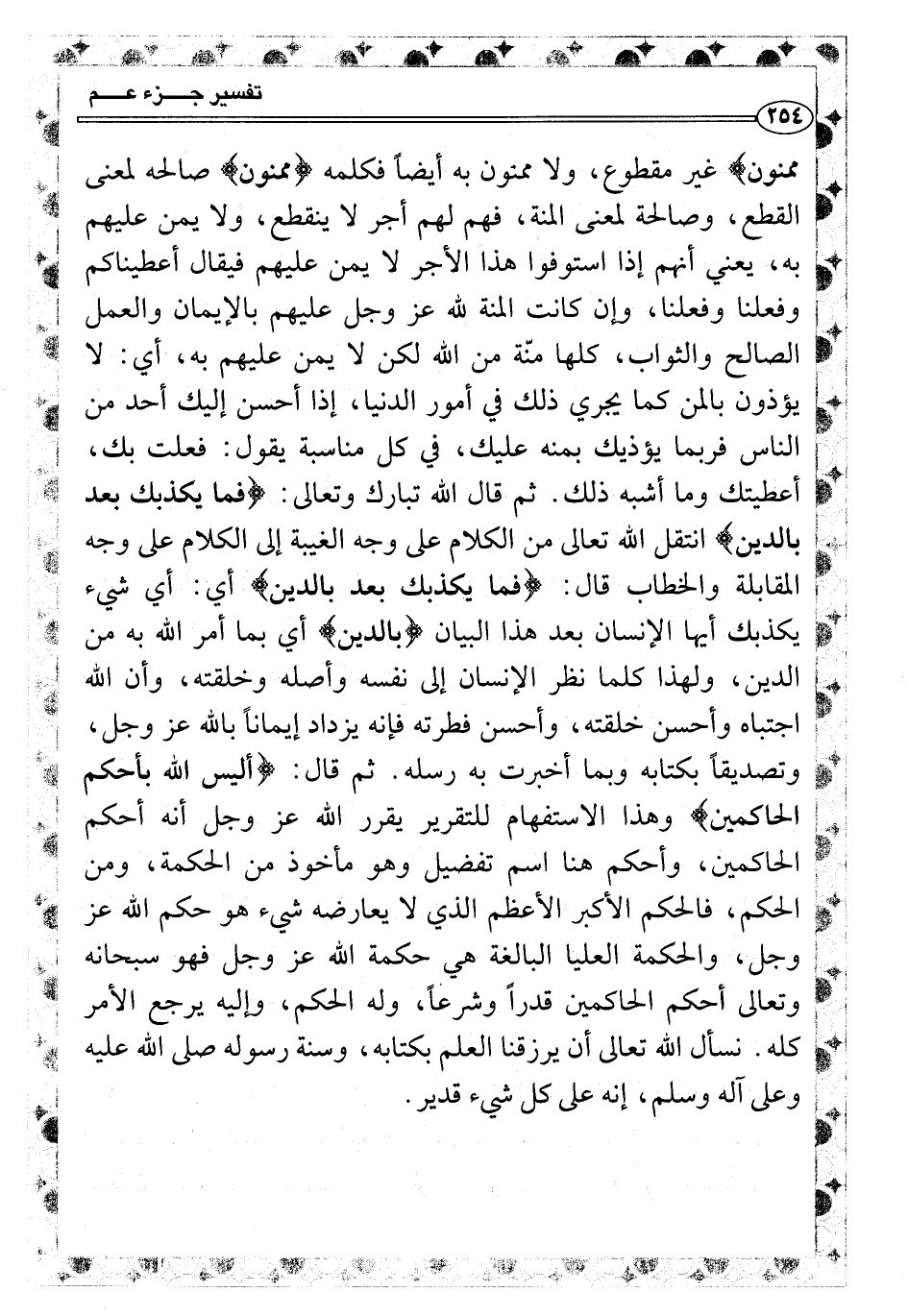 ممنون} غير مقطوع، ولا ممنون به أيضاً فكلمه {ممنون} صالحه لمعنى القطع، وصالحة لمعنى المنة، فهم لهم أجر لا ينقطع، ولا يمن عليهم به، يعني أنهم إذا استوفوا هذا الأجر لا يمن عليهم فيقال أعطيناكم وفعلنا وفعلنا، وإن كانت المنة لله عز وجل عليهم بالإيمان والعمل الصالح والثواب، كلها منّة من الله لكن لا يمن عليهم به، أي: لا يؤذون بالمن كما يجري ذلك في أمور الدنيا، إذا أحسن إليك أحد من الناس فربما يؤذيك بمنه عليك، في كل مناسبة يقول: فعلت بك، أعطيتك وما أشبه ذلك.