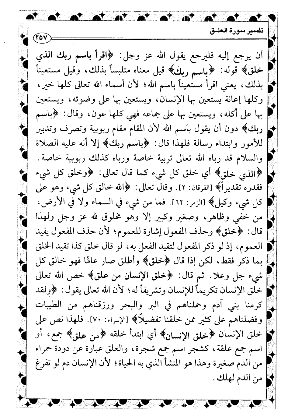 أن يرجع إليه فليرجع يقول الله عز وجل: {اقرأ باسم ربك الذي خلق} قوله: {باسم ربك} قيل معناه متلبساً بذلك، وقيل مستعيناً بذلك، يعني اقرأ مستعيناً باسم الله؛ لأن أسماء الله تعالى كلها خير، وكلها إعانة يستعين بها الإنسان، ويستعين بها على وضوئه، ويستعين بها على أكله، ويستعين بها على جماعه فهي كلها عون، وقال: {باسم ربك} دون أن يقول باسم الله لأن المقام مقام ربوبية وتصرف وتدبير للأمور وابتداء رسالة فلهذا قال: {باسم ربك} إلا أنه عليه الصلاة والسلام قد رباه الله تعالى تربية خاصة ورباه كذلك ربوبية خاصة. {الذي خلق} أي خلق كل شيء كما قال تعالى: {وخلق كل شيء فقدره تقديراً} [الفرقان: 2] . وقال تعالى: {الله خالق كل شيء وهو على كل شيء وكيل} [الزمر: 62] . فما من شيء في السماء ولا في الأرض، من خفي وظاهر، وصغير وكبير إلا وهو مخلوق لله عز وجل ولهذا قال: {خلق} وحذف المفعول إشارة للعموم؛ لأن حذف المفعول يفيد العموم، إذ لو ذكر المفعول لتقيد الفعل به، لو قال خلق كذا تقيد الخلق بما ذكر فقط، لكن إذا قال {خلق} وأطلق صار عامًّا فهو خالق كل شيء جل وعلا. ثم قال: {خلق الإنسان من علق} خص الله تعالى خلق الإنسان تكريماً للإنسان وتشريفاً له؛ لأن الله تعالى يقول: {ولقد كرمنا بني آدم وحملناهم في البر والبحر ورزقناهم من الطيبات وفضلناهم على كثير ممن خلقنا تفضيلاً} [الإسراء: 70] .