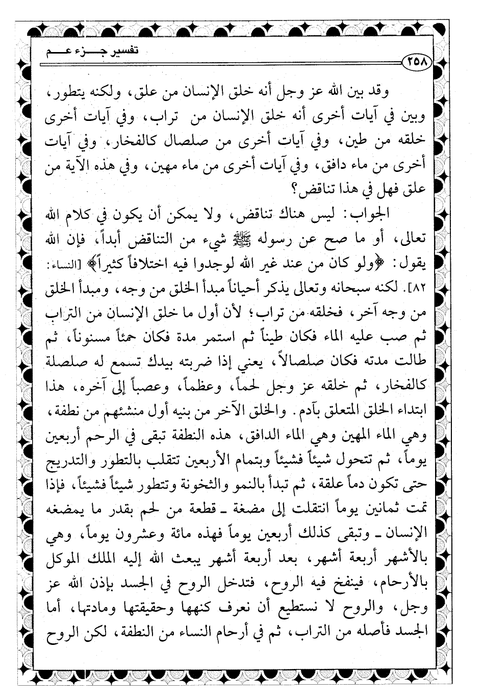 الجواب: ليس هناك تناقض، ولا يمكن أن يكون في كلام الله تعالى، أو ما صح عن رسوله صلى الله عليه وسلّم شيء من التناقض أبداً، فإن الله يقول: {ولو كان من عند غير الله لوجدوا فيه اختلافاً كثيراً} [النساء: 82] . لكنه سبحانه وتعالى يذكر أحياناً مبدأ الخلق من وجه، ومبدأ الخلق من وجه آخر، فخلقه من تراب؛ لأن أول ما خلق الإنسان من التراب ثم صب عليه الماء فكان طيناً ثم استمر مدة فكان حمئاً مسنوناً، ثم طالت مدته فكان صلصالاً، يعني إذا ضربته بيدك تسمع له صلصلة كالفخار، ثم خلقه عز وجل لحماً، وعظماً، وعصباً إلى آخره، هذا ابتداء الخلق المتعلق بآدم. والخلق الآخر من بنيه أول منشئهم من نطفة، وهي الماء المهين وهي الماء الدافق، هذه النطفة تبقى في الرحم أربعين يوماً، ثم تتحول شيئاً فشيئاً وبتمام الأربعين تتقلب بالتطور والتدريج حتى تكون دماً علقة، ثم تبدأ بالنمو والثخونة وتتطور شيئاً فشيئاً، فإذا تمت ثمانين يوماً انتقلت إلى مضغة ـ قطعة من لحم بقدر ما يمضغه الإنسان ـ وتبقى كذلك أربعين يوماً فهذه مائة وعشرون يوماً، وهي بالأشهر أربعة أشهر، بعد أربعة أشهر يبعث الله إليه الملك الموكل بالأرحام، فينفخ فيه الروح، فتدخل الروح في الجسد بإذن الله عز وجل، والروح لا نستطيع أن نعرف كنهها وحقيقتها ومادتها، أما الجسد فأصله من التراب، ثم في أرحام النساء من النطفة، لكن الروح
