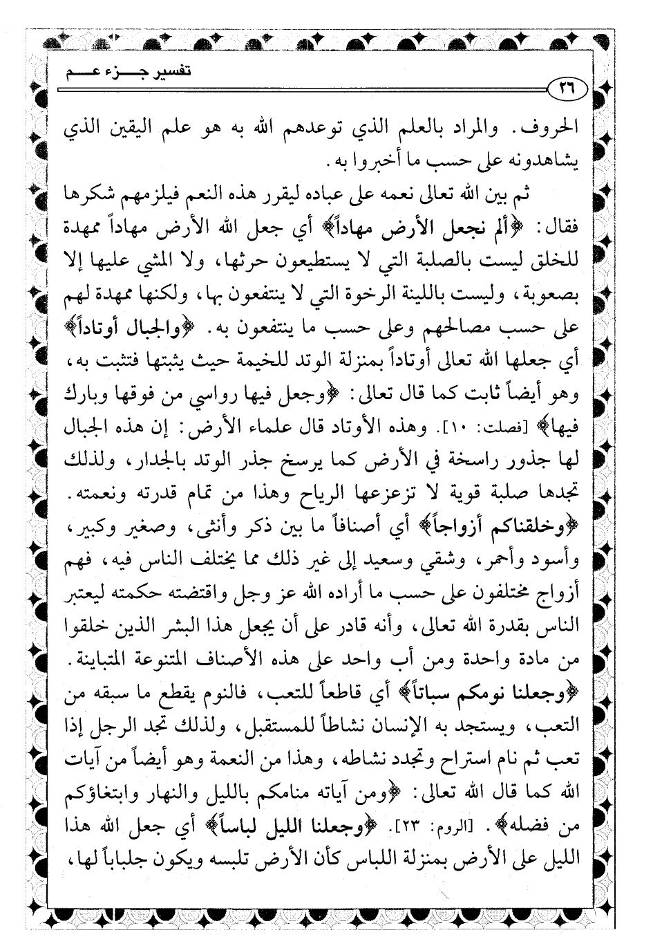 ثم بين الله تعالى نعمه على عباده ليقرر هذه النعم فيلزمهم شكرها فقال: {ألم نجعل الأرض مهاداً} أي جعل الله الأرض مهاداً ممهدة للخلق ليست بالصلبة التي لا يستطيعون حرثها، ولا المشي عليها إلا بصعوبة، وليست باللينة الرخوة التي لا ينتفعون بها، ولا يستقرون فيها، ولكنها ممهدة لهم على حسب مصالحهم وعلى حسب ما ينتفعون به. {والجبال أوتاداً} أي جعلها الله تعالى أوتاداً للأرض بمنزلة الوتد للخيمة حيث يثبتها فتثبت به، وهي أيضاً ثابتة كما قال تعالى: {وجعل فيها رواسي من فوقها وبارك فيها} [فصلت: 10] . وهذه الأوتاد قال علماء الأرض: إن هذه الجبال لها جذور راسخة في الأرض كما يرسخ جذر الوتد بالجدار، أو وتد الخيمة في الأرض ولذلك تجدها صلبة قوية لا تزعزعها الرياح وهذا من تمام قدرته ونعمته. {وخلقناكم أزواجاً} أي أصنافاً ما بين ذكر وأنثى، وصغير وكبير، وأسود وأحمر، وشقي وسعيد إلى غير ذلك مما يختلف الناس فيه، فهم أزواج مختلفون على حسب ما أراده الله عز وجل واقتضته حكمته ليعتبر الناس بقدرة الله تعالى، وأنه قادر على أن يجعل هذا البشر الذين خلقوا من مادة واحدة ومن أب واحد على هذه الأصناف المتنوعة المتباينة. {وجعلنا نومكم سباتاً} أي قاطعاً للتعب، فالنوم يقطع ما سبقه من التعب، ويستجد به الإنسان نشاطاً للمستقبل، ولذلك تجد الرجل إذا تعب ثم نام استراح وتجدد نشاطه، وهذا من النعمة وهو أيضاً من آيات الله كما قال الله تعالى: {ومن آياته منامكم بالليل والنهار وابتغاؤكم من فضله} . [الروم: 23] .