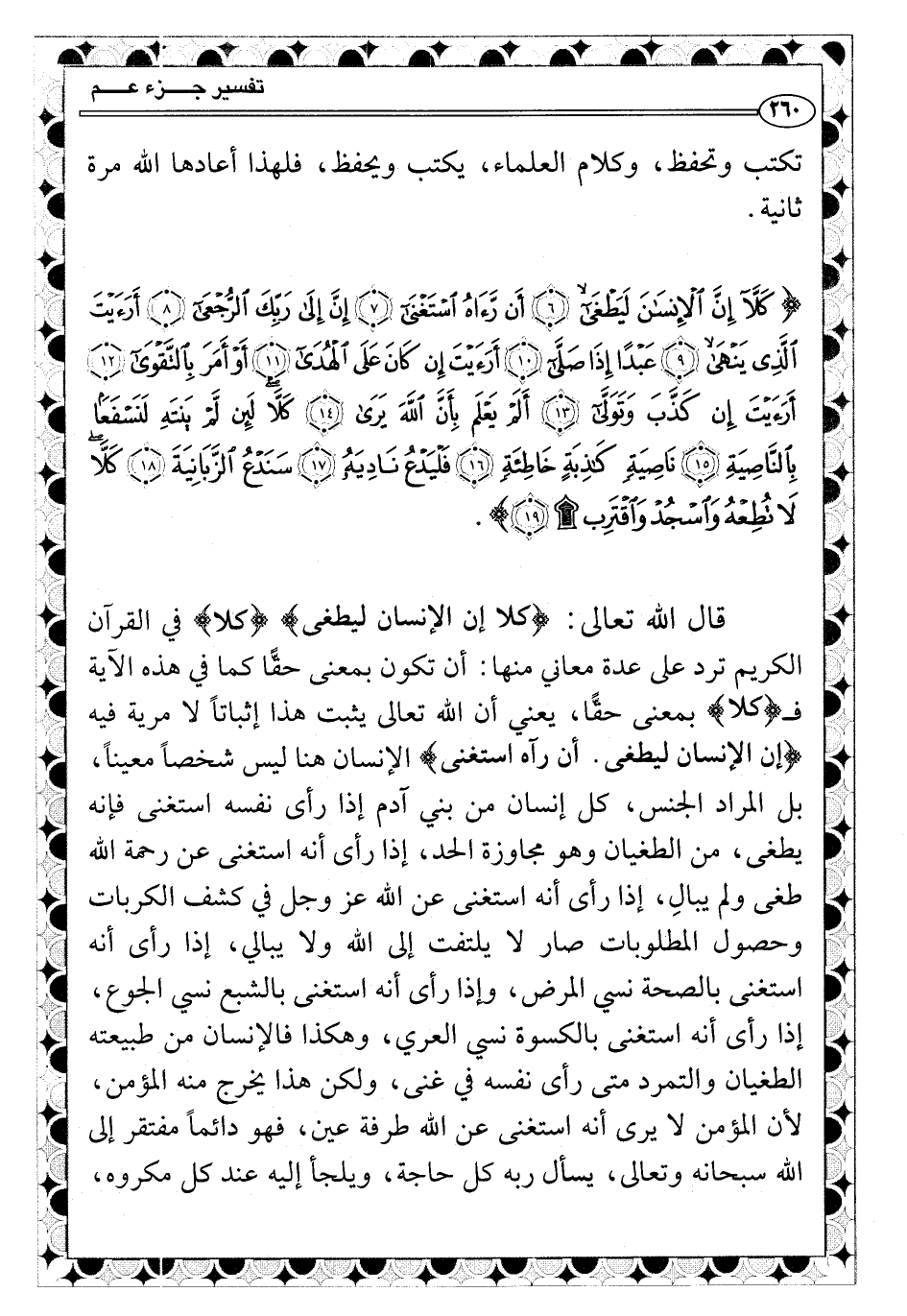 قال الله تعالى: {كلا إن الإنسان ليطغى} {كلا} في القرآن الكريم ترد على عدة معاني منها: أن تكون بمعنى حقًّا كما في هذه الآية فـ {كلا} بمعنى حقًّا، يعني أن الله تعالى يثبت هذا إثباتاً لا مرية فيه {إن الإنسان ليطغى. أن رآه استغنى} الإنسان هنا ليس شخصاً معيناً، بل المراد الجنس، كل إنسان من بني آدم إذا رأى نفسه استغنى فإنه يطغى، من الطغيان وهو مجاوزة الحد، إذا رأى أنه استغنى عن رحمة الله طغى ولم يبالِ، إذا رأى أنه استغنى عن الله عز وجل في كشف الكربات وحصول المطلوبات صار لا يلتفت إلى الله ولا يبالي، إذا رأى أنه استغنى بالصحة نسي المرض، وإذا رأى أنه استغنى بالشبع نسي الجوع، إذا رأى أنه استغنى بالكسوة نسي العري، وهكذا فالإنسان من طبيعته الطغيان والتمرد متى رأى نفسه في غنى، ولكن هذا يخرج منه المؤمن، لأن المؤمن لا يرى أنه استغنى عن الله طرفة عين، فهو دائماً مفتقر إلى الله سبحانه وتعالى، يسأل ربه كل حاجة، ويلجأ إليه عند كل مكروه،