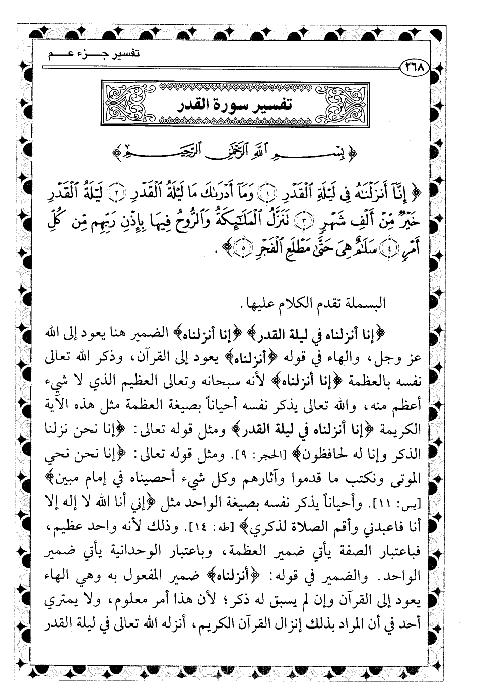 {إنا أنزلناه في ليلة القدر} {إنا أنزلناه} الضمير هنا يعود إلى الله عز وجل، والهاء في قوله {أنزلناه} يعود إلى القرآن، وذكر الله تعالى نفسه بالعظمة {إنا أنزلناه} لأنه سبحانه وتعالى العظيم الذي لا شيء أعظم منه، والله تعالى يذكر نفسه أحياناً بصيغة العظمة مثل هذه الآية الكريمة {إنا أنزلناه في ليلة القدر} ومثل قوله تعالى: {إنا نحن نزلنا الذكر وإنا له لحافظون} [الحجر: 9] . ومثل قوله تعالى: {إنا نحن نحي الموتى ونكتب ما قدموا وآثارهم وكل شيء أحصيناه في إمام مبين} [يس: 11] . وأحياناً يذكر نفسه بصيغة الواحد مثل {إنني أنا الله لا إله إلا أنا فاعبدني وأقم الصلاة لذكري} [طه: 14] . وذلك لأنه واحد عظيم، فباعتبار الصفة يأتي ضمير العظمة، وباعتبار الوحدانية يأتي ضمير الواحد. والضمير في قوله: {أنزلناه} ضمير المفعول به وهي الهاء يعود إلى القرآن وإن لم يسبق له ذكر؛ لأن هذا أمر معلوم، ولا يمتري أحد في أن المراد بذلك إنزال القرآن الكريم، أنزله الله تعالى في ليلة القدر
