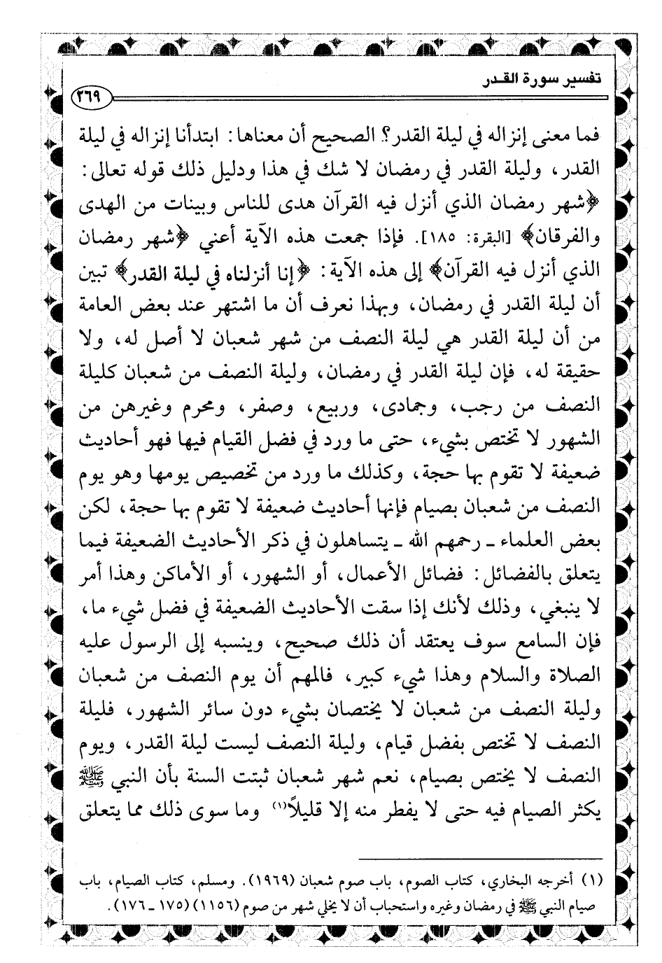 فإذا جمعت هذه الآية أعني {شهر رمضان الذي أنزل فيه القرآن} إلى هذه الآية: {إنا أنزلناه في ليلة القدر} تبين أن ليلة القدر في رمضان، وبهذا نعرف أن ما اشتهر عند بعض العامة من أن ليلة القدر هي ليلة النصف من شهر شعبان لا أصل له، ولا حقيقة له، فإن ليلة القدر في رمضان، وليلة النصف من شعبان كليلة النصف من رجب، وجمادى، وربيع، وصفر، ومحرم وغيرهن من الشهور لا تختص بشيء، حتى ما ورد في فضل القيام فيها فهو أحاديث ضعيفة لا تقوم بها حجة، وكذلك ما ورد من تخصيص يومها وهو يوم النصف من شعبان بصيام فإنها أحاديث ضعيفة لا تقوم بها حجة، لكن بعض العلماء ـ رحمهم الله ـ يتساهلون في ذكر الأحاديث الضعيفة فيما يتعلق بالفضائل: فضائل الأعمال، أو الشهور، أو الأماكن وهذا أمر لا ينبغي، وذلك لأنك إذا سقت الأحاديث الضعيفة في فضل شيء ما، فإن السامع سوف يعتقد أن ذلك صحيح، وينسبه إلى الرسول عليه الصلاة والسلام وهذا شيء كبير، فالمهم أن يوم النصف من شعبان وليلة النصف من شعبان لا يختصان بشيء دون سائر الشهور، فليلة النصف لا تختص بفضل قيام، وليلة النصف ليست ليلة القدر، ويوم النصف لا يختص بصيام، نعم شهر شعبان ثبتت السنة بأن النبي صلى الله عليه وسلّم يكثر الصيام فيه حتى لا يفطر منه إلا قليلاً (¬1) وما سوى ذلك مما يتعلق
