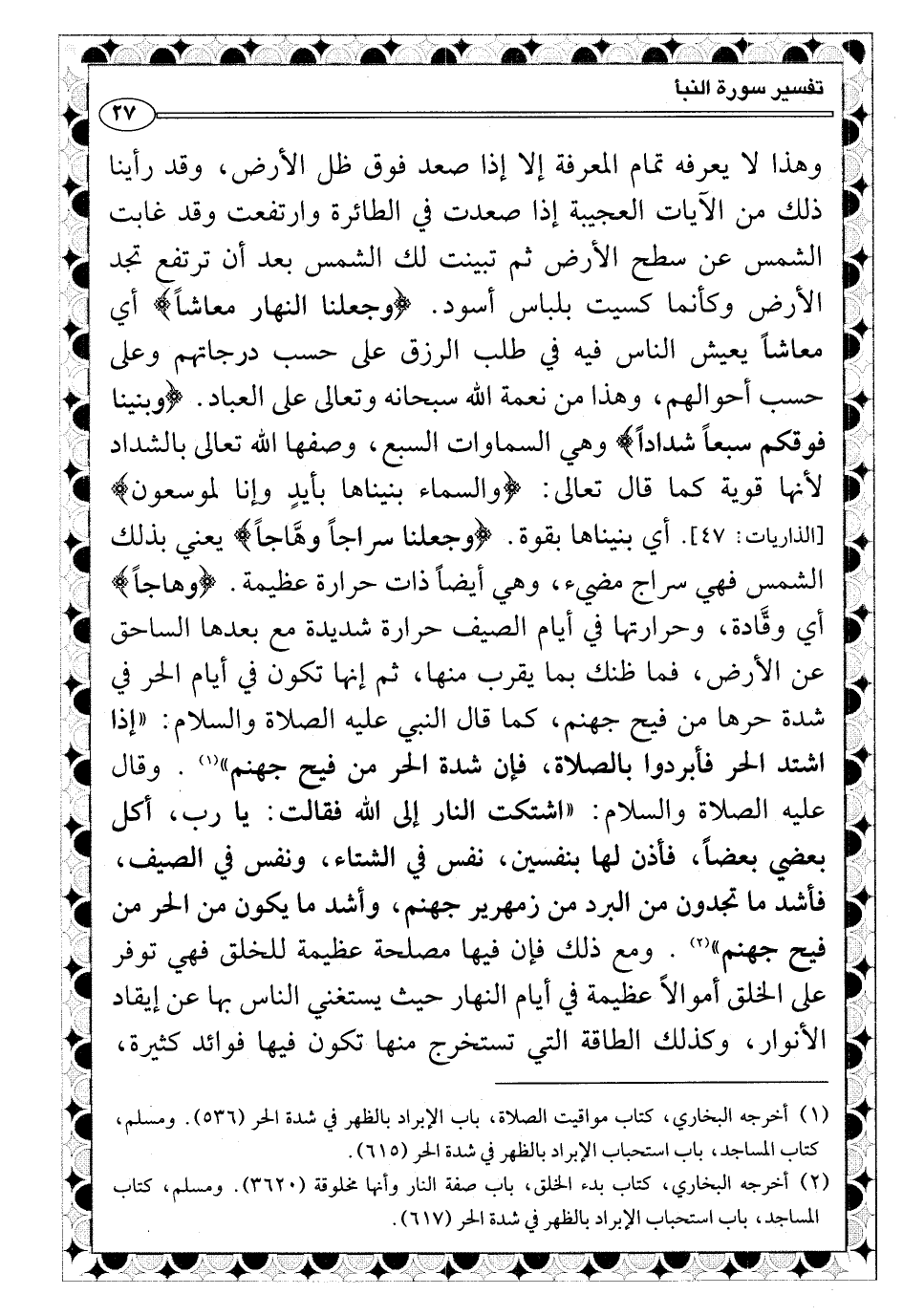 وهذا لا يعرفه تمام المعرفة إلا من صعد فوق ظل الأرض، وقد رأينا ذلك من الايات العجيبة إذا صعدت في الطائرة وارتفعت وقد غابت الشمس عن سطح الأرض ثم تبينت لك الشمس بعد أن ترتفع تجد الأرض وكأنما كسيت بلباس أسود. لا ترى شيئاً من الأرض كله سواد من تحتك فتبين من هذا معنى قوله تعالى: {وجعلنا الليل لباسا} {وجعلنا النهار معاشاً} أي معاشاً يعيش الناس فيه في طلب الرزق على حسب درجاتهم وعلى حسب أحوالهم، وهذا من نعمة الله سبحانه وتعالى على العباد. {وبنينا فوقكم سبعاً شداداً} وهي السماوات السبع، وصفها الله تعالى بالشداد لأنها قوية كما قال تعالى: {والسماء بنيناها بأيدٍ وإنا لموسعون} [الذاريات: 47] . أي بنيناها بقوة. {وجعلنا سراجاً وهَّاجاً} يعني بذلك الشمس فهي سراج مضيء، وهي أيضاً ذات حرارة عظيمة. {وهاجاً} أي وقَّادة، وحرارتها في أيام الصيف حرارة شديدة مع بعدها الساحق عن الأرض، فما ظنك بما يقرب منها، ثم إنها تكون في أيام الحر في شدة حرها من فيح جهنم، (¬1) كما قال النبي عليه الصلاة والسلام: «إذا اشتد الحر فأبردوا بالصلاة، فإن شدة الحر من فيح جهنم» . وقال عليه الصلاة والسلام: «اشتكت النار إلى الله فقالت: يا رب، أكل بعضي بعضاً، فأذن لها بنفسين، نفس في الشتاء، ونفس في الصيف، فأشد ما تجدون من البرد من زمهرير جهنم، وأشد ما يكون من الحر من فيح جهنم» (¬2) .