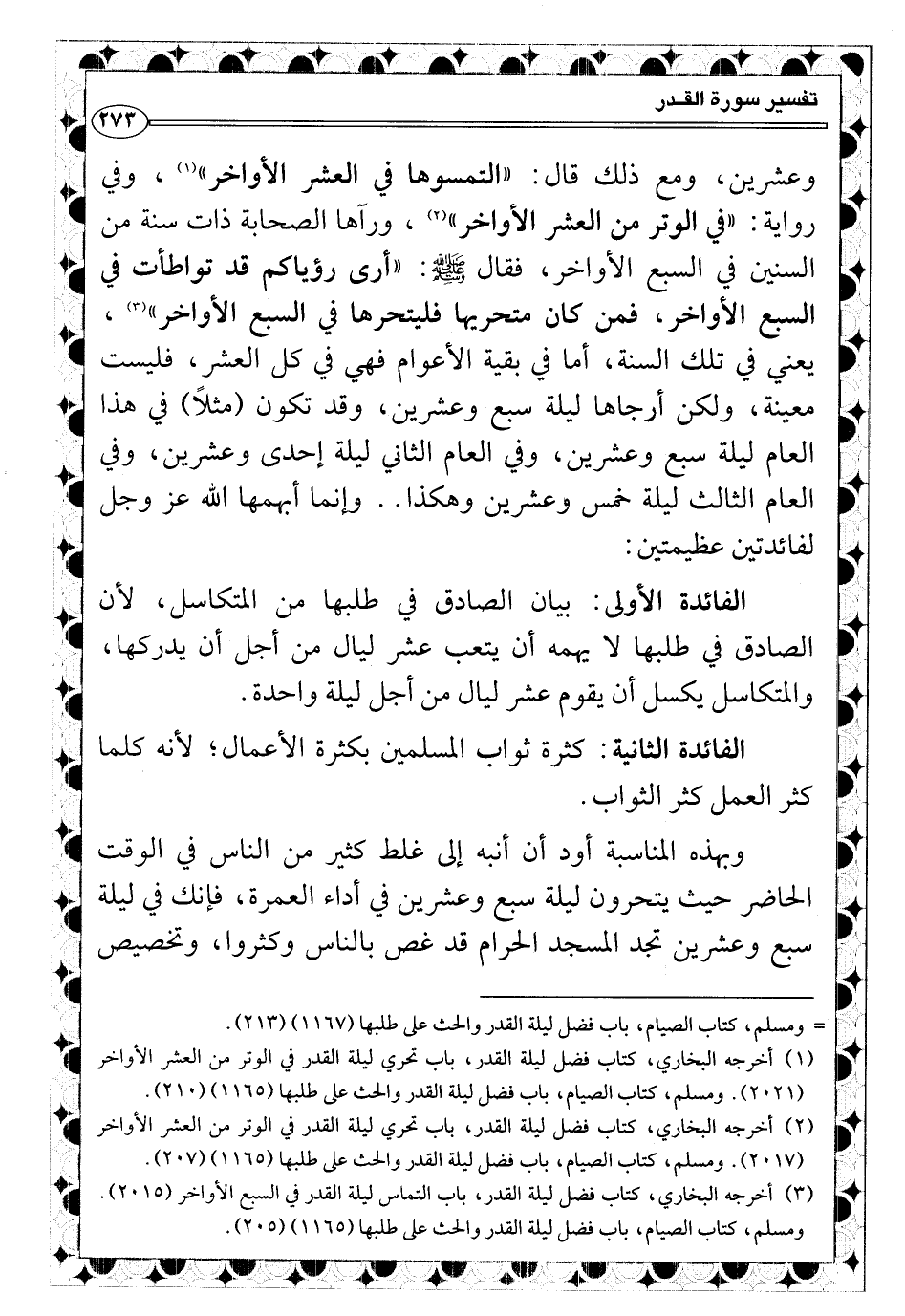 الفائدة الأولى: بيان الصادق في طلبها من المتكاسل، لأن الصادق في طلبها لا يهمه أن يتعب عشر ليال من أجل أن يدركها، والمتكاسل يكسل أن يقوم عشر ليال من أجل ليلة واحدة.