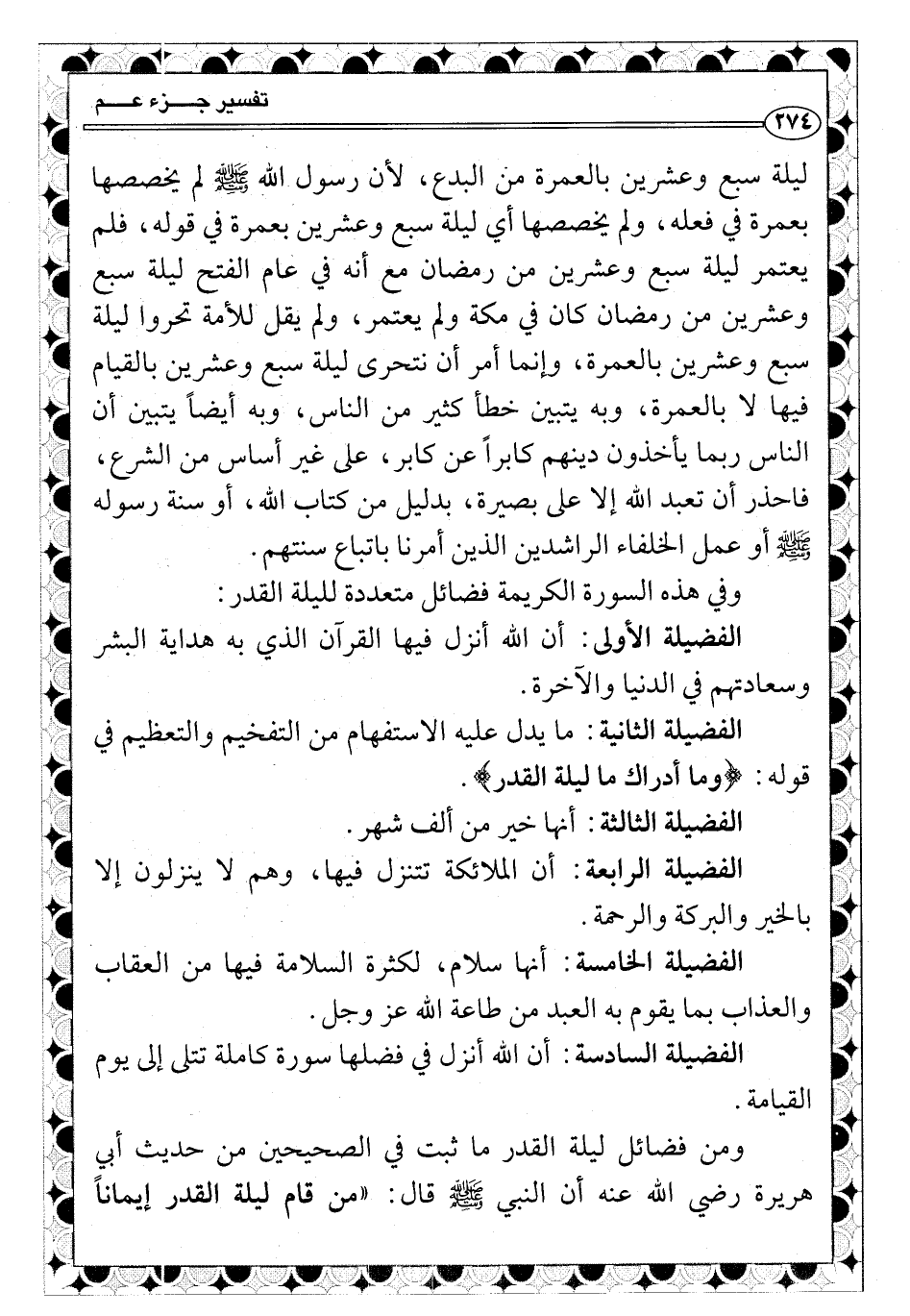 ليلة سبع وعشرين بالعمرة من البدع، لأن رسول الله صلى الله عليه وسلّم لم يخصصها بعمرة في فعله، ولم يخصصها أي ليلة سبع وعشرين بعمرة في قوله، فلم يعتمر ليلة سبع وعشرين من رمضان مع أنه في عام الفتح ليلة سبع وعشرين من رمضان كان في مكة ولم يعتمر، ولم يقل للأمة تحروا ليلة سبع وعشرين بالعمرة، وإنما أمر أن نتحرى ليلة سبع وعشرين بالقيام فيها لا بالعمرة، وبه يتبين خطأ كثير من الناس، وبه أيضاً يتبين أن الناس ربما يأخذون دينهم كابراً عن كابر، على غير أساس من الشرع، فاحذر أن تعبد الله إلا على بصيرة، بدليل من كتاب الله، أو سنة رسوله صلى الله عليه وسلّم أو عمل الخلفاء الراشدين الذين أمرنا باتباع سنتهم.