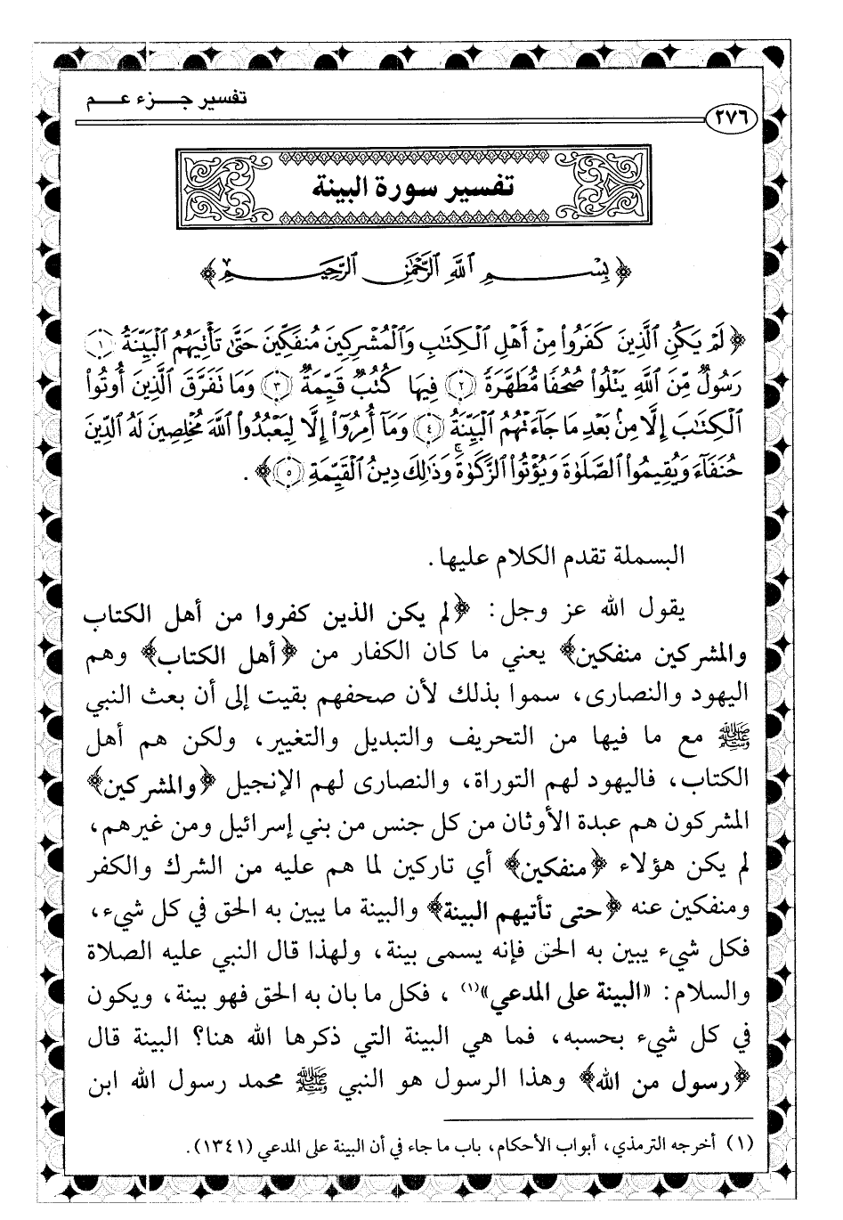 يقول الله عز وجل: {لم يكن الذين كفروا من أهل الكتاب والمشركين منفكين} يعني ما كان الكفار من {أهل الكتاب} وهم اليهود والنصارى، سموا بذلك لأن صحفهم بقيت إلى أن بعث النبي صلى الله عليه وسلّم مع ما فيها من التحريف والتبديل والتغيير، ولكن هم أهل الكتاب، فاليهود لهم التوراة، والنصارى لهم الإنجيل {والمشركين} المشركون هم عبدة الأوثان من كل جنس من بني إسرائيل ومن غيرهم، لم يكن هؤلاء {منفكين} أي تاركين لما هم عليه من الشرك والكفر ومنفكين عنه {حتى تأتيهم البينة} والبينة ما يبين به الحق في كل شيء، فكل شيء يبين به الحق فإنه يسمى بينة، ولهذا قال النبي عليه الصلاة والسلام: «البينة على المدعي» (¬1) ، فكل ما بان به الحق فهو بينة، ويكون في كل شيء بحسبه، فما هي البينة التي ذكرها الله هنا؟ البينة قال {رسول من الله} وهذا الرسول هو النبي صلى الله عليه وسلّم محمد رسول الله ابن