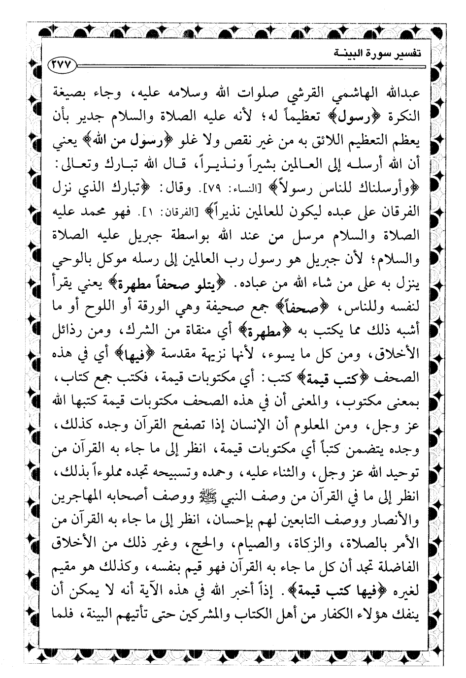 {يتلو صحفاً مطهرة} يعني يقرأ لنفسه وللناس، {صحفاً} جمع صحيفة وهي الورقة أو اللوح أو ما أشبه ذلك مما يكتب به {مطهرة} أي منقاة من الشرك، ومن رذائل الأخلاق، ومن كل ما يسوء، لأنها نزيهة مقدسة {فيها} أي في هذه الصحف {كتب قيمة} كتب: أي مكتوبات قيمة، فكتب جمع كتاب، بمعنى مكتوب، والمعنى أن في هذه الصحف مكتوبات قيمة كتبها الله عز وجل، ومن المعلوم أن الإنسان إذا تصفح القرآن وجده كذلك، وجده يتضمن كتباً أي مكتوبات قيمة، انظر إلى ما جاء به القرآن من توحيد الله عز وجل، والثناء عليه، وحمده وتسبيحه تجده مملوءاً بذلك، انظر إلى ما في القرآن من وصف النبي صلى الله عليه وسلّم ووصف أصحابه المهاجرين والأنصار ووصف التابعين لهم بإحسان، انظر إلى ما جاء به القرآن من الأمر بالصلاة، والزكاة، والصيام، والحج، وغير ذلك من الأخلاق الفاضلة تجد أن كل ما جاء به القرآن فهو قيم بنفسه، وكذلك هو مقيم لغيره {فيها كتب قيمة} .