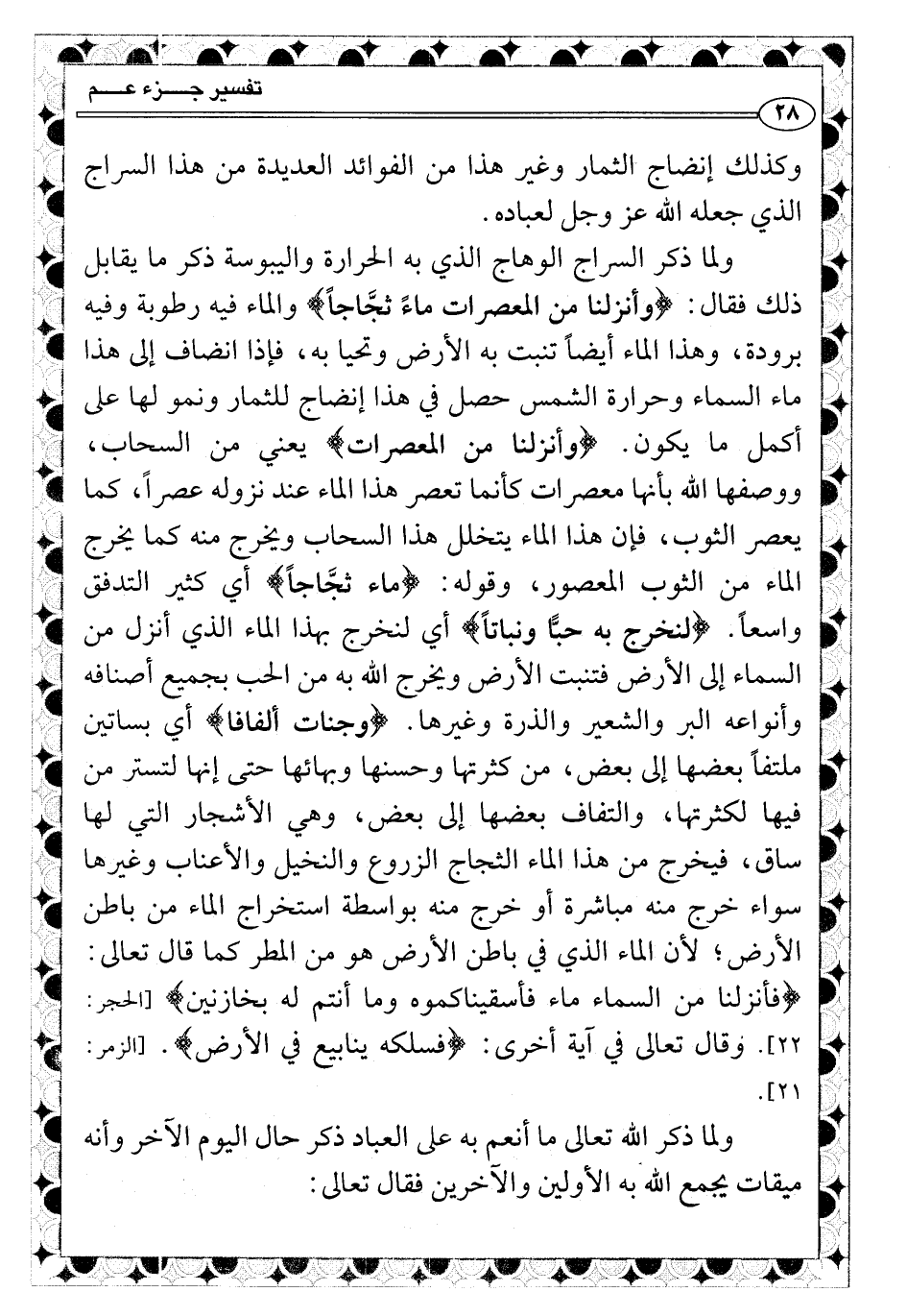 ولما ذكر السراج الوهاج الذي به الحرارة واليبوسة ذكر ما يقابل ذلك فقال: {وأنزلنا من المعصرات ماءً ثجَّاجاً} والماء فيه رطوبة وفيه برودة، وهذا الماء أيضاً تنبت به الأرض وتحيا به، فإذا انضاف ماء السماء إلى حرارة الشمس حصل في هذا إنضاج للثمار ونمو لها على أكمل ما يكون. {وأنزلنا من المعصرات} يعني من السحاب، ووصفها الله بأنها معصرات كأنما تعصر هذا المطر عند نزوله عصراً، كما يعصر الثوب، فإن هذا الماء يتخلل هذا السحاب ويخرج منه كما يخرج الماء من الثوب المعصور، وقوله: {ماء ثجَّاجاً} أي كثير لثج يعني الإنهمار والتدفق وذلك لغزارته وقوته حتى يروي الأرض. {لنخرج به} أي لنخرج بهذا الماء الذي أنزل من السماء إلى الأرض {حبًّا ونباتاً} فتنبت الأرض ويخرج الله به من الحب بجميع أصنافه وأنواعه البر والشعير والذرة وغيرها. والنبات من الثمار كالتين والعنب وما أشبه ذلك {وجنات ألفافا} أي بساتين ملتفاً بعضها إلى بعض، من كثرتها وحسنها وبهائها حتى إنها لتستر من فيها لكثرتها، والتفاف بعضها إلى بعض، وهي الأشجار التي لها ساق، فيخرج من هذا الماء الثجاج الزروع والنخيل والأعناب وغيرها سواء خرج منه مباشرة أو خرج منه بواسطة استخراج الماء من باطن الأرض؛ لأن الماء الذي في باطن الأرض هو من المطر كما قال تعالى: {فأنزلنا من السماء ماء فأسقيناكموه وما أنتم له بخازنين} [الحجر: 22] . وقال تعالى في آية أخرى: {فسلكه ينابيع في الأرض} . [الزمر: 21] .