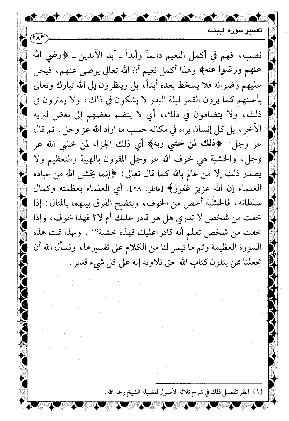 نصب، فهم في أكمل النعيم دائماً وأبداً ـ أبد الآبدين ـ {رضي الله عنهم ورضوا عنه} وهذا أكمل نعيم أن الله تعالى يرضى عنهم، فيحل عليهم رضوانه فلا يسخط بعده أبداً، بل وينظرون إلى الله تبارك وتعالى بأعينهم كما يرون القمر ليلة البدر لا يشكون في ذلك، ولا يمترون في ذلك، ولا يتضامون في ذلك، أي لا ينضم بعضهم إلى بعض ليريه الآخر، بل كل إنسان يراه في مكانه حسب ما أراد الله عز وجل. ثم قال عز وجل: {ذلك لمن خشي ربه} أي ذلك الجزاء لمن خشي الله عز وجل، والخشية هي خوف الله عز وجل المقرون بالهيبة والتعظيم ولا يصدر ذلك إلا من عالم بالله كما قال تعالى: {إنما يخشى الله من عباده العلماء إن الله عزيز غفور} [فاطر: 28] . أي العلماء بعظمته وكمال سلطانه، فالخشية أخص من الخوف، ويتضح الفرق بينهما بالمثال: إذا خفت من شخص لا تدري هل هو قادر عليك أم لا؟ فهذا خوف، وإذا خفت من شخص تعلم أنه قادر عليك فهذه خشية. (¬1) وبهذا تمت هذه السورة العظيمة وتم ما تيسر لنا من الكلام على تفسيرها، ونسأل الله أن يجعلنا ممن يتلون كتاب الله حق تلاوته إنه على كل شيء قدير.