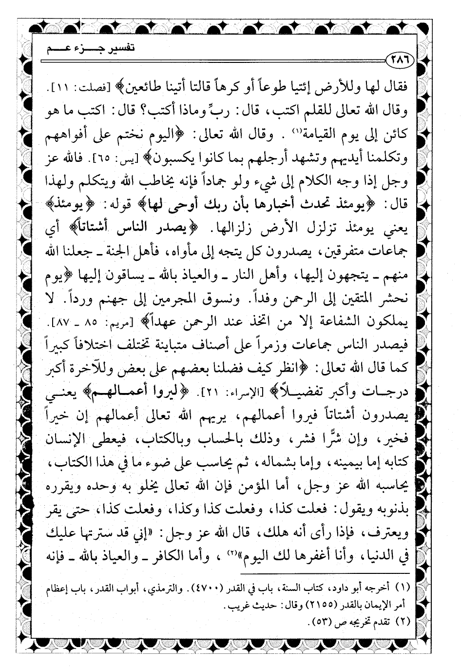 فقال لها وللأرض إئتيا طوعاً أو كرهاً قالتا أتينا طائعين} [فصلت: 11] . وقال الله تعالى للقلم اكتب، قال: ربِّ وماذا أكتب؟ قال: اكتب ما هو كائن إلى يوم القيامة (¬1) . وقال الله تعالى: {اليوم نختم على أفواههم وتكلمنا أيديهم وتشهد أرجلهم بما كانوا يكسبون} [يس: 65] . فالله عز وجل إذا وجه الكلام إلى شيء ولو جماداً فإنه يخاطب الله ويتكلم ولهذا قال: {يومئذ تحدث أخبارها بأن ربك أوحى لها} قوله: {يومئذ} يعني يومئذ تزلزل الأرض زلزالها.