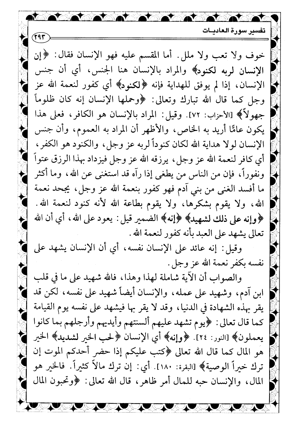 خوف ولا تعب ولا ملل. أما المقسم عليه فهو الإنسان فقال: {إن الإنسان لربه لكنود} والمراد بالإنسان هنا الجنس، أي أن جنس الإنسان، إذا لم يوفق للهداية فإنه {لكنود} أي كفور لنعمة الله عز وجل كما قال الله تبارك وتعالى: {وحملها الإنسان إنه كان ظلوماً جهولاً} [الأحزاب: 72] . وقيل: المراد بالإنسان هو الكافر، فعلى هذا يكون عامًّا أريد به الخاص، والأظهر أن المراد به العموم، وأن جنس الإنسان لولا هداية الله لكان كنوداً لربه عز وجل، والكنود هو الكفر، أي كافر لنعمة الله عز وجل، يرزقه الله عز وجل فيزداد بهذا الرزق عتواً ونفوراً، فإن من الناس من يطغى إذا رآه قد استغنى عن الله، وما أكثر ما أفسد الغنى من بني آدم فهو كفور بنعمة الله عز وجل، يجحد نعمة الله، ولا يقوم بشكرها، ولا يقوم بطاعة الله لأنه كنود لنعمة الله. {وإنه على ذلك لشهيد} {إنه} الضمير قيل: يعود على الله، أي أن الله تعالى يشهد على العبد بأنه كفور لنعمة الله.