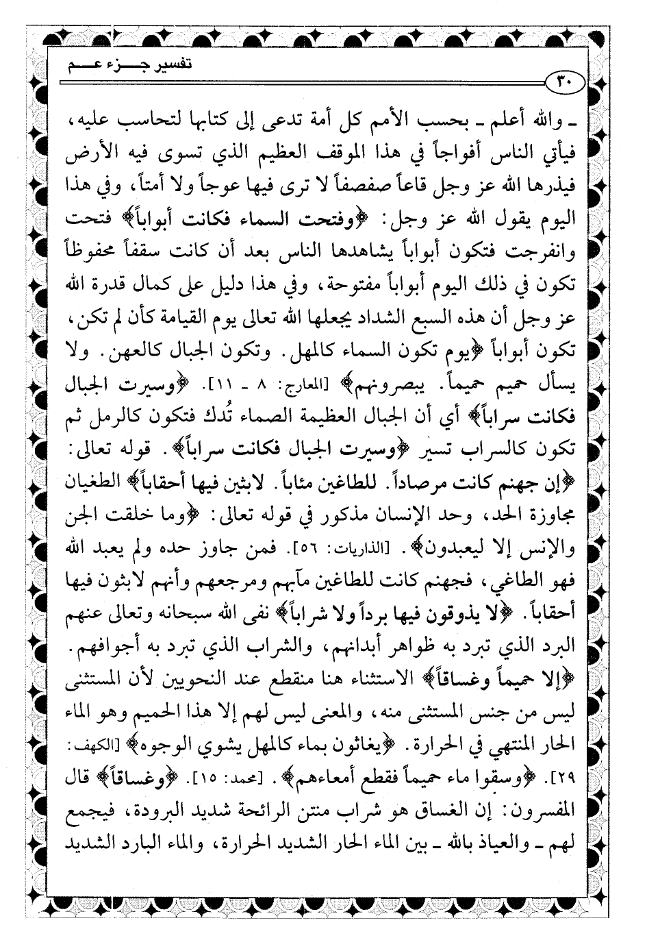 وثم صفة أخرى ذكرها الله في قوله: {وسيرت الجبال فكانت سراباً} أي أن الجبال العظيمة الصماء تُدك فتكون كالرمل ثم تكون كالسراب تسير {وسيرت الجبال فكانت سراباً} . قوله تعالى: {إن جهنم كانت مرصاداً أي مرصدة ومعدة للطاغين وجهنم أسم من أسماء كثيرة وسميت بهذا الأسملأنها ذات جهمة وظلمة بسوادها وقعرها أعاذنا الله وإياكم منها وهي مرصاد للطاغين قد اعدها الله عز وجل لهم من الآن فهي موجودة كما قال تعالى: {واتقوا النار التي أعدت للكافرين} [البقرة: 24] حين عرضت عليه وهو يصلي صلاة الكسوف (¬1) . ورأي فيها إمرأة تعذب في قطة لها حبستها لا هي أطعمتها ولا أرسلتها تاكل من خشاش الأرض (¬2) ؛ ورأي فيها عمرو بن لحي الخزاعي يجر قصبه في النار (¬3) يعني امعائه لأنه كان أول من أدخل الشرك على العرب؛ هذه النار يقول الله عز وجل أنها: {للطاغين مآبا} والطاغون جمع طاغ وهو الذي تجاوز الحد كما قال تعالى: {إنا لما طغى الماء حملناكم في الجارية} [الحاقة: 11] . أي زاد وتجاوز حده وحد النسان مذكور في قوله تعالى: {وما خلقت الجن والإنس إلا ليعبدون} . [الذاريات: 56] .