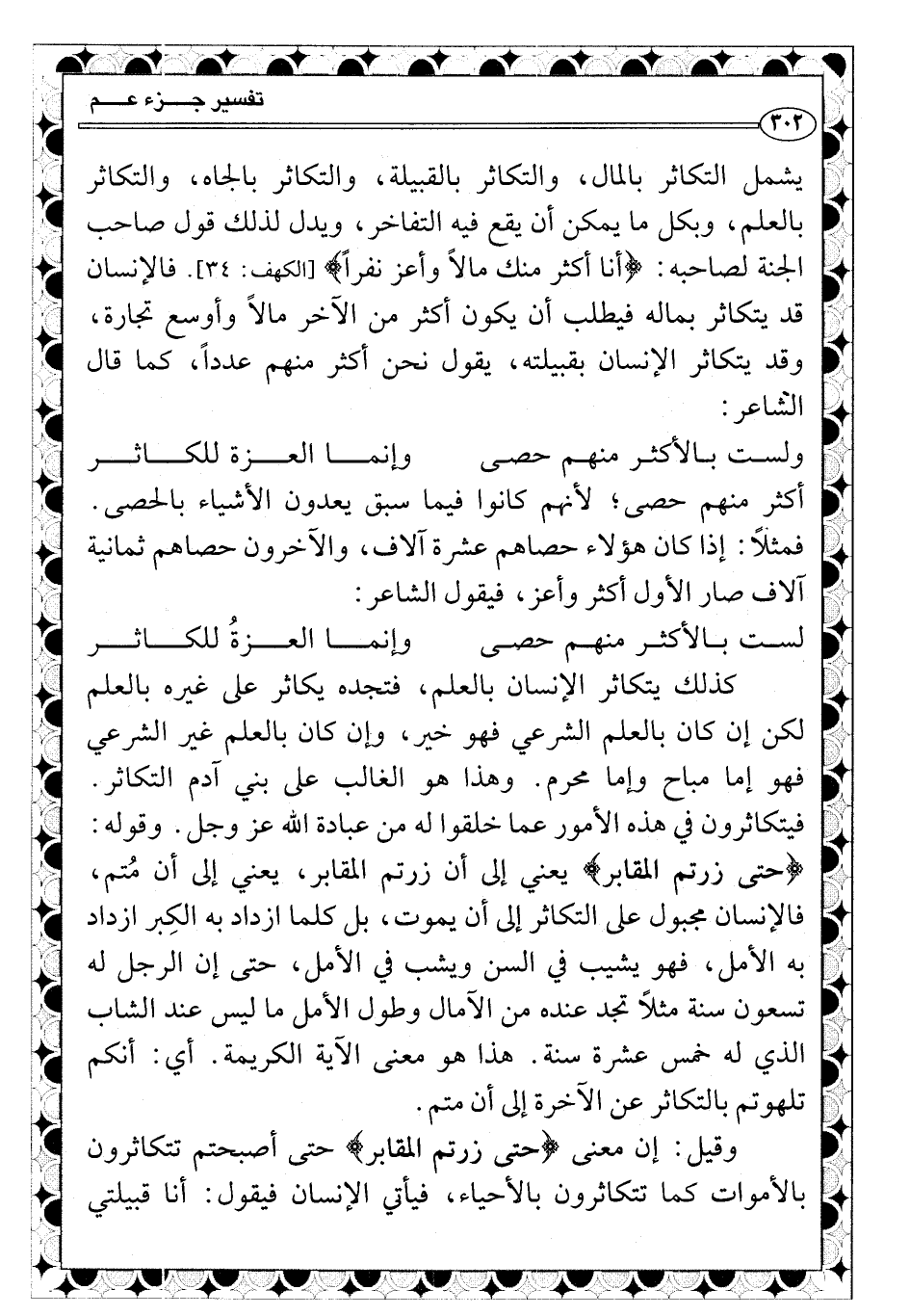 يشمل التكاثر بالمال، والتكاثر بالقبيلة، والتكاثر بالجاه، والتكاثر بالعلم، وبكل ما يمكن أن يقع فيه التفاخر، ويدل لذلك قول صاحب الجنة لصاحبه: {أنا أكثر منك مالاً وأعز نفراً} [الكهف: 34] . فالإنسان قد يتكاثر بماله فيطلب أن يكون أكثر من الآخر مالاً وأوسع تجارة، وقد يتكاثر الإنسان بقبيلته، يقول نحن أكثر منهم عدداً، كما قال الشاعر: