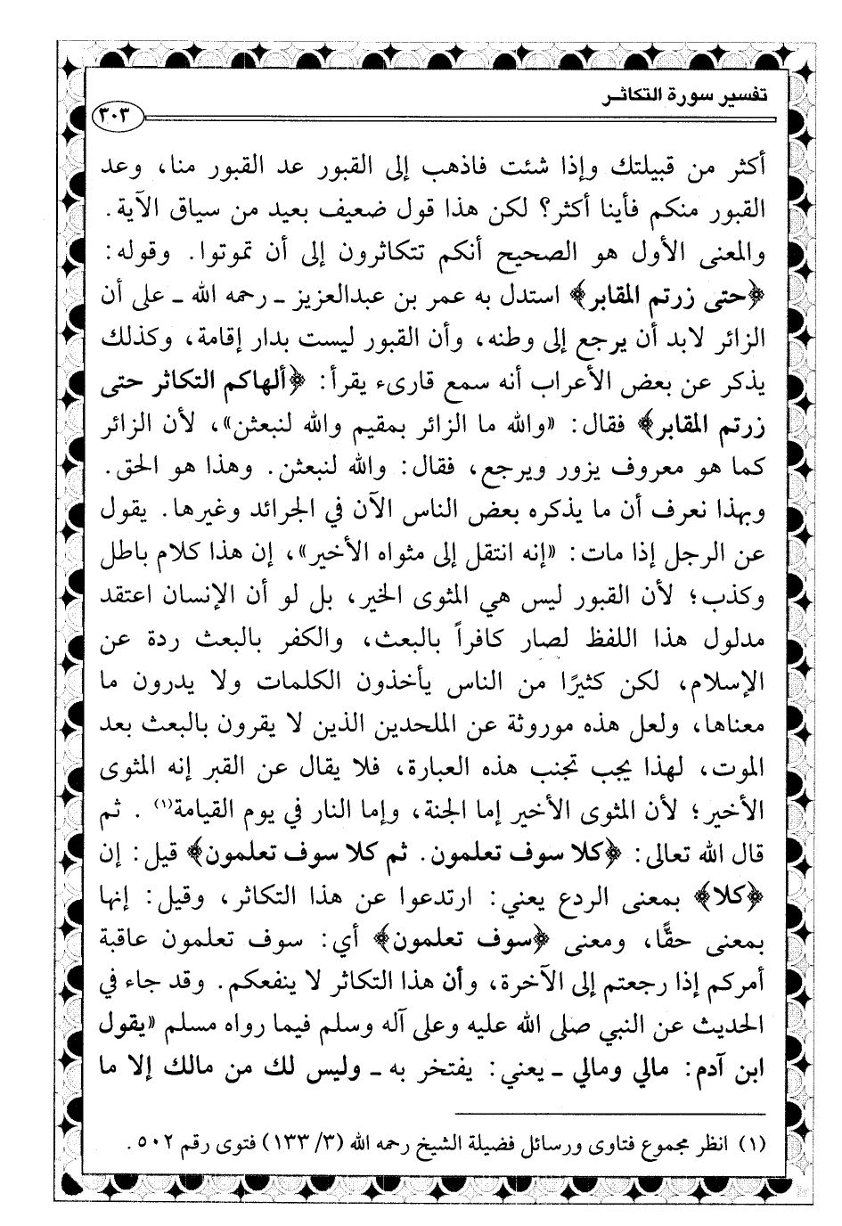 أكثر من قبيلتك وإذا شئت فاذهب إلى القبور عد القبور منا، وعد القبور منكم فأينا أكثر؟ لكن هذا قول ضعيف بعيد من سياق الآية. والمعنى الأول هو الصحيح أنكم تتكاثرون إلى أن تموتوا. وقوله: {حتى زرتم المقابر} استدل به عمر بن عبد العزيز ـ رحمه الله ـ على أن الزائر لابد أن يرجع إلى وطنه، وأن القبور ليست بدار إقامة، وكذلك يذكر عن بعض الأعراب أنه سمع قارىء يقرأ: {ألهاكم التكاثر حتى زرتم المقابر} فقال: «والله ما الزائر بمقيم والله لنبعثن» ، لأن الزائر كما هو معروف يزور ويرجع، فقال: والله لنبعثن. وهذا هو الحق. وبهذا نعرف أن ما يذكره بعض الناس الآن في الجرائد وغيرها. يقول عن الرجل إذا مات: «إنه انتقل إلى مثواه الأخير» ، إن هذا كلام باطل وكذب؛ لأن القبور ليس هي المثوى الخير، بل لو أن الإنسان اعتقد مدلول هذا اللفظ لصار كافراً بالبعث، والكفر بالبعث ردة عن الإسلام، لكن كثيًرا من الناس يأخذون الكلمات ولا يدرون ما معناها، ولعل هذه موروثة عن الملحدين الذين لا يقرون بالبعث بعد الموت، لهذا يجب تجنب هذه العبارة، فلا يقال عن القبر إنه المثوى الأخير؛ لأن المثوى الأخير إما الجنة، وإما النار في يوم القيامة (¬1) . ثم قال الله تعالى: {كلا سوف تعلمون. ثم كلا سوف تعلمون} قيل: إن {كلا} بمعنى الردع يعني: ارتدعوا عن هذا التكاثر، وقيل: إنها بمعنى حقًّا، ومعنى {سوف تعلمون} أي: سوف تعلمون عاقبة أمركم إذا رجعتم إلى الآخرة، وأن هذا التكاثر لا ينفعكم.