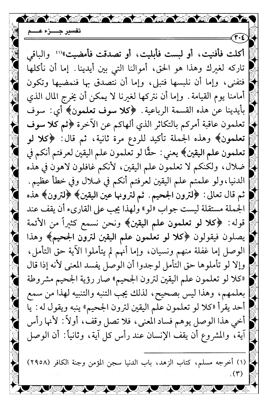 أكلت فأفنيت، أو لبست فأبليت، أو تصدقت فأمضيت» (¬1) والباقي تاركه لغيرك وهذا هو الحق، أموالنا التي بين أيدينا. إما أن نأكلها فتفنى، وإما أن نلبسها فتبلى، وإما أن نتصدق بها فنمضيها وتكون أمامنا يوم القيامة. وإما أن نتركها لغيرنا لا يمكن أن يخرج المال الذي بأيدينا عن هذه القسمة الرباعية. {كلا سوف تعلمون} أي: سوف تعلمون عاقبة أمركم بالتكاثر الذي ألهاكم عن الآخرة {ثم كلا سوف تعلمون} وهذه الجملة تأكيد للردع مرة ثانية، ثم قال: {كلا لو تعلمون علم اليقين} يعني: حقًّا لو تعلمون علم اليقين لعرفتم أنكم في ضلال، ولكنكم لا تعلمون علم اليقين، لأنكم غافلون لاهون في هذه الدنيا، ولو علمتم علم اليقين لعرفتم أنكم في ضلال وفي خطأ عظيم. ثم قال تعالى: {لترون الجحيم.